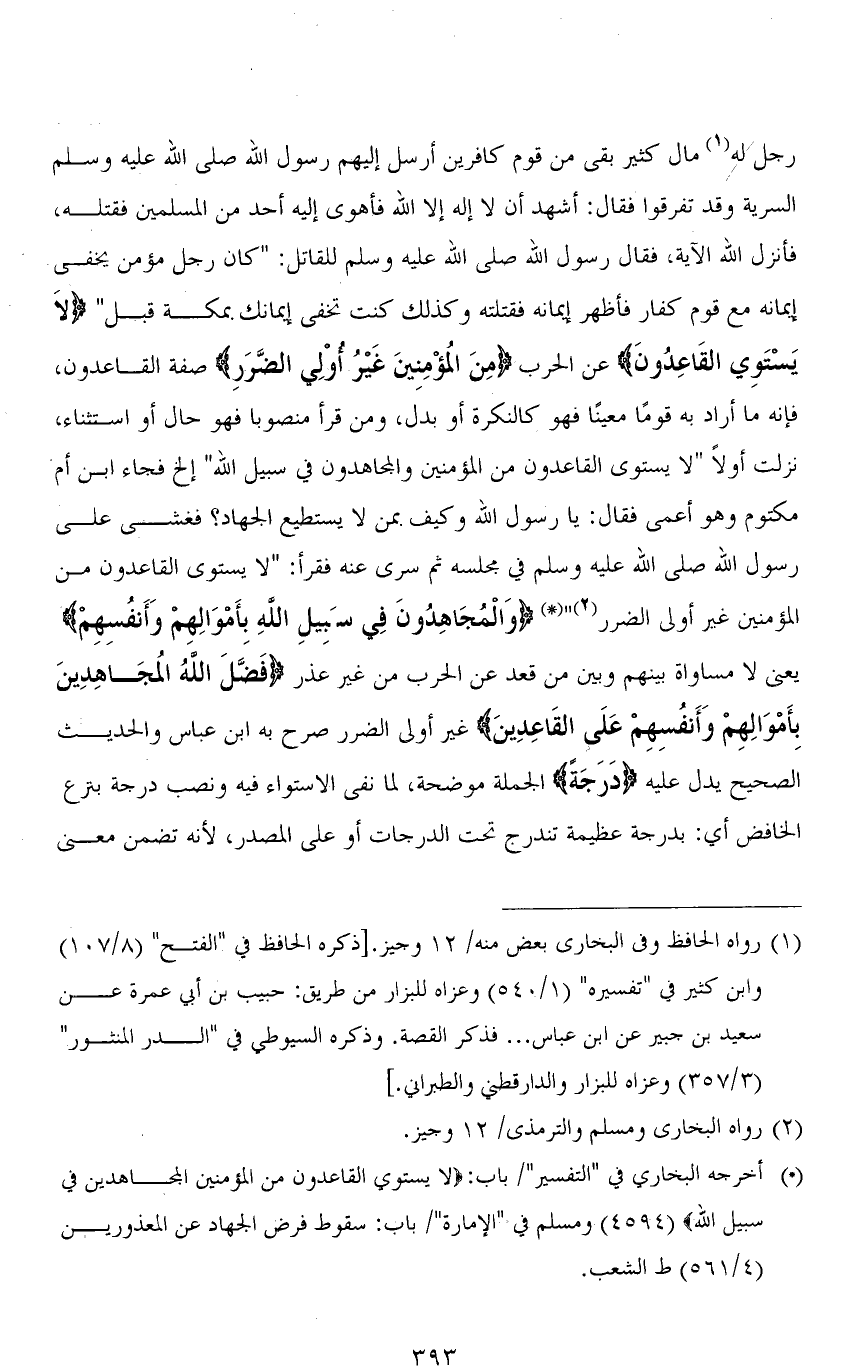رجل له مال كثير بقي من قوم كافرين أرسل إليهم رسول الله صلى الله عليه وسلم السرية وقد تفرقوا فقال: أشهد أن لا إله إلا الله فأهوى إليه أحد من المسلمين فقتله، فأنزل الله الآية، فقال رسول الله صلى الله عليه وسلم للقاتل: " كان رجل مؤمن يخفي إيمانه مع قوم كفار فأظهر إيمانه فقتلته وكذلك كنت تخفي إيمانك بمكة قبل " (لاَ يَسْتَوِي القَاعِدُونَ) عن الحرب (مِنَ المُؤْمِنِينَ غَيْرُ أُوْلِي الضَّرَرِ) صفة القاعدون، فإنه ما أراد به قومًا معينًا فهو كالنكرة أو بدل، ومن قرأ منصوبًا فهو حال أو استثناء، نزلت أولاً " لا يستوى القاعدون من المؤمنين والمجاهدون في سبيل الله " إلخ فجاء ابن أم مكتوم وهو أعمى فقال: يا رسول الله وكيف بمن لا يستطيع الجهاد؟ فغشي على رسول الله صلى الله عليه وسلم في مجلسه ثم سرى عنه فقرأ: (لَا يَسْتَوِي الْقَاعِدُونَ مِنَ الْمُؤْمِنِينَ غَيْرُ أُولِي الضَّرَرِ) (وَالْمُجَاهِدُونَ فِي سَبِيلِ اللهِ بِأَمْوَالِهِمْ وَأَنْفُسِهِمْ) يعني لا مساواة بينهم وبين من قعد عن الحرب من غير عذر (فَضَّلَ اللهُ الْمُجَاهِدِينَ بِأَمْوَالِهِمْ وَأَنْفُسِهِمْ عَلَى الْقَاعِدِينَ) غَيْرُ أُولِي الضَّرَرِ صرح به ابن عباس والحديث الصحيح يدل عليه (دَرَجَةً) الجملة موضحة، لما نفي الاستواء فيه ونصب درجة بنزع الخافض أي: بدرجة عظيمة تندرج تحت الدرجات أو على المصدر، لأنه تضمن معنى