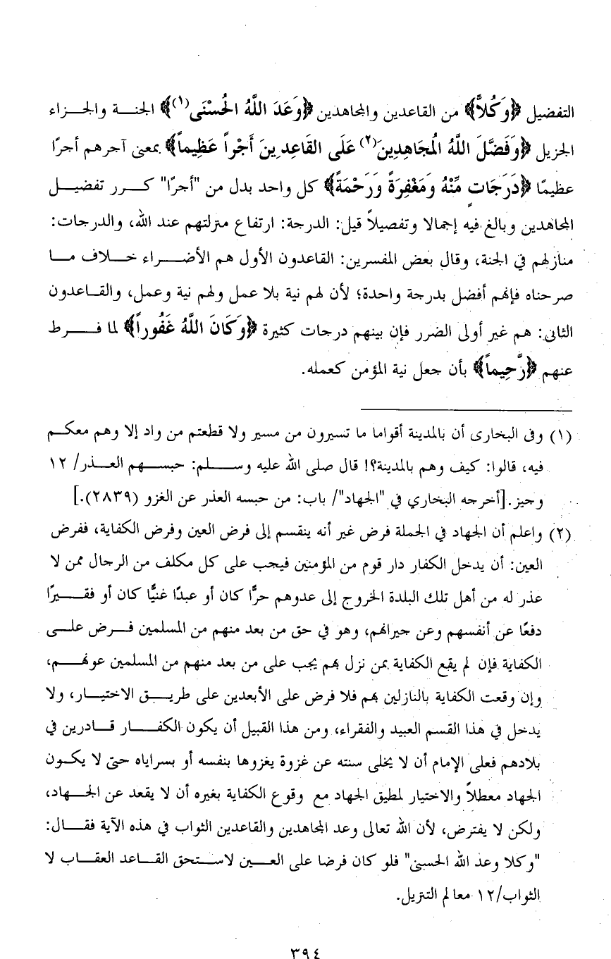 التفضيل (وَكُلًّا) من القاعدين والمجاهدين (وَعَدَ اللهُ الْحُسْنَى) الجنة والجزاء الجزيل (وَفَضَّلَ اللهُ المُجَاهِدِينَ عَلَى القَاعِدِينَ أَجْراً عَظِيمًا) بمعنى آجرهم أجرًا عظيمًا (دَرَجَاتٍ مِنْهُ وَمَغْفِرَةً وَرَحْمَةً) كل واحد بدل من " أجرًا " كرر تفضيل المجاهدين وبالغ فيه إجمالاً وتفصيلاً قيل: الدرجة: ارتفاع منزلتهم عند الله، والدرجات: منازلهم في الجنة، وقال بعض المفسرين: القاعدون الأول هم الأضراء خلاف ما صرحناه فإنهم أفضل بدرجة واحدة؛ لأن لهم نية بلا عمل ولهم نية وعمل، والقاعدون الثاني: هم غير أولي الضرر فإن بينهم درجات كثيرة (وَكَانَ اللهُ غَفُورًا) لما فرط عنهم (رحِيماً) بأن جعل نية المؤمن كعمله.