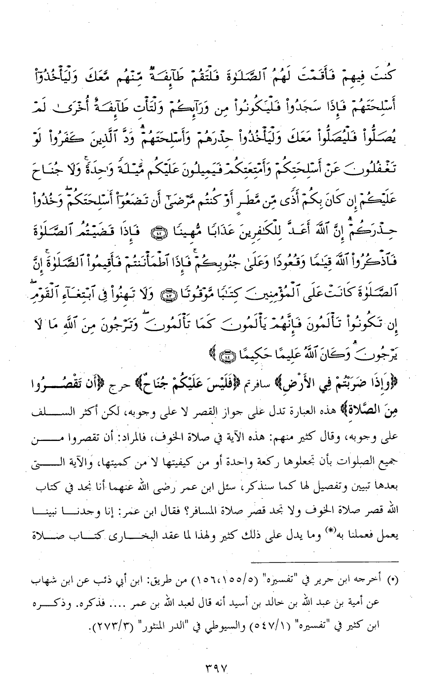 (وَإِذَا ضَرَبتُمْ فِي الأَرْضِ) سافرتم (فَلَيْسَ عَلَيْكُمْ جُنَاحٌ) حرج (أَن تَقْصُرُوا مِنَ الصَّلاةِ) هذه العبارة تدل على جواز القصر لا على وجوبه، لكن أكثر السلف على وجوبه، وقال كثير منهم: هذه الآية في صلاة الخوف، فالمراد: أن تقصروا من جميع الصلوات بأن تجعلوها ركعة واحدة أو من كيفيتها لا من كميتها، والآية التي بعدها تبيين وتفصيل لها كما سنذكر، سئل ابن عمر رضى الله عنهما أنا نجد في كتاب الله قصر صلاة الخوف ولا تجد قصر صلاة المسافر؟ فقال ابن عمر: إنا وجدنا نبينا يعمل فعملنا به وما يدل على ذلك كثير ولهذا لما عقد البخاري كتاب صلاة