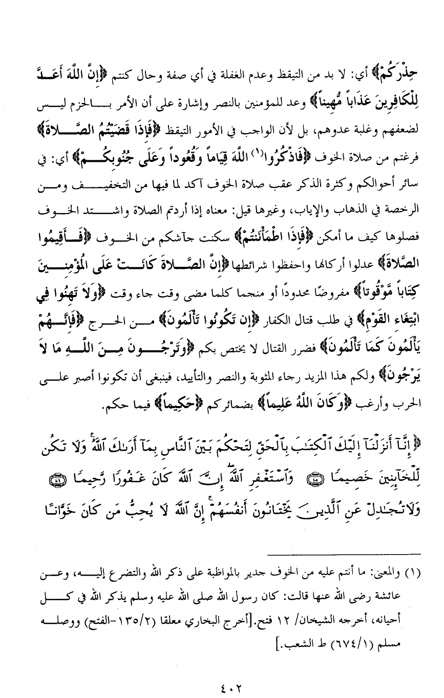 حِذْرَكُمْ) أي: لا بد من التيقظ وعدم الغفلة في أي صفة وحال كنتم (إِنَّ اللهَ أَعَدَّ لِلْكَافِرِينَ عَذَابًا مُهِينًا) وعد للمؤمنين بالنصر وإشارة على أن الأمر بالحزم ليس لضعفهم وغلبة عدوهم، بل لأن الواجب في الأمور التيقظ (فَإِذَا قَضَيْتُمُ الصَّلَاةَ) فرغتم من صلاة الخوف (فَاذْكُرُوا الله قِيَاماً وَقُعوداً وَعَلَى جُنُوبِكُمْ) أي: في سائر أحوالكم وكثرة الذكر عقب صلاة الخوف آكد لما فيها من التخفيف ومن الرخصة في الذهاب والإياب، وغيرها قيل: معناه إذا أردتم الصلاة واشتد الخوف فصلوها كيف ما أمكن (فَإِذَا اطْمَأْنَنْتُمْ) سكنت جآشكم من الخوف (فَأَقِيمُوا الصَّلَاةَ) عدلوا أركانها واحفظوا شرائطها (إِنَّ الصَّلَاةَ كَانَتْ عَلَى الْمُؤْمِنِينَ كِتَابًا مَوْقُوتًا) مفروضًا محدودًا أو منجما كلما مضى وقت جاء وقت (وَلَا تَهِنُوا فِي