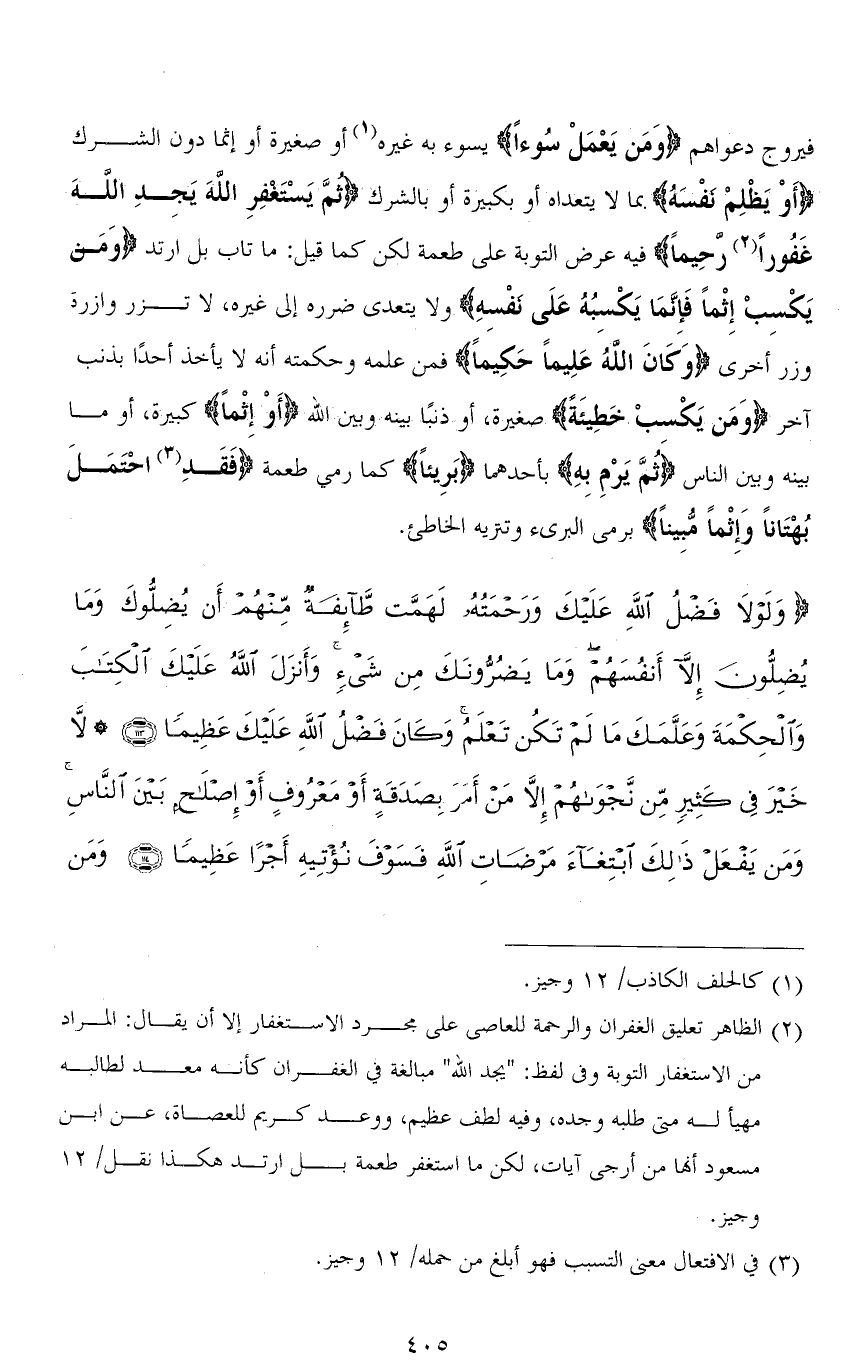 فيروج دعواهم (وَمَنْ يَعْمَلْ سُوءًا) يسوء به غيره أو صغيرة أو إثمًا دون الشرك (أَوْ يَظْلِمْ نَفْسَهُ) بما لا يتعداه أو بكبيرة أو بالشرك (ثُمَّ يَسْتَغفِرِ الله يَجِدِ اللهَ غفُوراً رحِيماً) فيه عرض التوبة على طعمة لكن كما قيل: ما تاب بل ارتد (وَمَنْ يَكْسِبْ إِثْمًا فَإِنَّمَا يَكْسِبُهُ عَلَى نَفْسِهِ) ولا يتعدى ضرره إلى غيره، لا تزر وازرة وزر أخرى (وَكَانَ اللهُ عَلِيمًا حَكِيمًا) فمن علمه وحكمته أنه لا يأخذ أحدًا بذنب آخر (وَمَنْ يَكْسِبْ خَطِيئَةً) صغيرة، أو ذنبًا بينه وبين الله (أَوْ إِثْماً) كبيرة، أو ما بينه وبين الناس (ثُمَّ يَرْمِ بِهِ) بأحدهما (بَرِيئًا) كما رمي طعمة (فَقَدِ احْتَمَلَ بُهْتَانًا وَإِثْمًا مُبِينًا) برمى البريء وتنزيه الخاطئ.