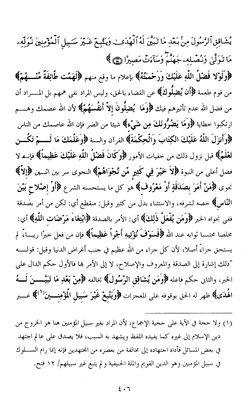 (وَلَوْلا فَضْلُ اللهِ عَلَيْكَ وَرَحْمتُهُ) بإعلام ما وقع منهم (لَهَمَّت طَائِفَةٌ منْهُمْ) من قوم طعمة (أَنْ يُضِلوكَ) عن القضاء بالحق، وليس المراد نفي همهم بل المراد أن من فضل الله عدم تأثيرهم فيك (وَمَا يُضِلونَ إِلا أَنفُسَهُمْ) لأن الله عصمك وهم ارتكبوا خطايا (وَمَا يَضُرُّونَكَ مِن شَيْء) شيئًا من الضر فإن الله عاصمك من الناس (وَأَنزَلَ اللهُ عَلَيْكَ الْكِتَابَ وَالْحِكْمَةَ) القرآن والسنة (وَعَلَّمَكَ مَا لَمْ تَكُن تَعْلَمُ) قبل نزول ذلك من خفيات الأمور (وَكَان فَضْلُ اللهِ عليْكَ عَظِيماً) فإنه لا فضل أعلى من النبوة (لَا خَيْرَ فِي كَثِيرٍ مِنْ نَجْوَاهُمْ) النجوى سر بين اثنين (إِلَّا) نجوى (مَنْ أَمَرَ بِصَدَقَةٍ أَوْ مَعْرُوف) هو كل ما يستحسنه الشرع (أَوْ إِصْلَاحٍ بَيْنَ النَّاسِ) خصه لشرفه، والاستثناء بدل من كثير وقيل: منقطع أي: لكن من أمر بصدقة ففي نجواه الخير (وَمَن يَّفْعَلْ ذَلِكَ) أي: الأمر بالصدقة (ابْتِغَاءَ مَرْضَاتِ اللهِ) أي: مخلصًا محتسبًا ثوابه عند الله (فَسَوْفَ نُؤْتِيهِ أَجْرًا عَظِيمًا) فإن من فعل خيرًا رياءً لم يستحق جزاءً أصلاً، لأن كل جزاء من الله عظيم في جنب أغراض الدنيا وقيل: قوله " ذلك إشارة إلى الصدقة والمعروف والإصلاح، لا إلى الأمر بها فالأول حكم الدال على الخير، والثاني حكم فاعله (وَمَن يُشَاقِقِ الرَّسُولَ) يخالفه (مِنْ بَعْدِ مَا تَبَيَّنَ لَهُ الهُدَى) ظهر له الحق بوقوفه على المعجزات (وَيَتَّبِعْ غَيْرَ سَبِيلِ المُؤْمِنِينَ) غير