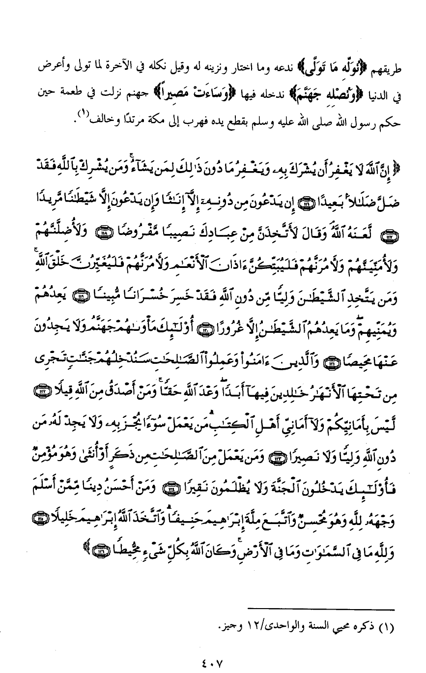 (إِنَّ اللهَ لَا يَغْفِرُ أَنْ يُشْرَكَ بِهِ وَيَغْفِرُ مَا دُونَ ذَلِكَ لِمَنْ يَشَاءُ وَمَنْ يُشْرِكْ بِاللهِ فَقَدْ ضَلَّ ضَلَالًا بَعِيدًا (116) إِنْ يَدْعُونَ مِنْ دُونِهِ إِلَّا إِنَاثًا وَإِنْ يَدْعُونَ إِلَّا شَيْطَانًا مَرِيدًا (117) لَعَنَهُ اللهُ وَقَالَ لَأَتَّخِذَنَّ مِنْ عِبَادِكَ نَصِيبًا مَفْرُوضًا (118) وَلَأُضِلَّنَّهُمْ وَلَأُمَنِّيَنَّهُمْ وَلَآمُرَنَّهُمْ فَلَيُبَتِّكُنَّ آذَانَ الْأَنْعَامِ وَلَآمُرَنَّهُمْ فَلَيُغَيِّرُنَّ خَلْقَ اللهِ وَمَنْ يَتَّخِذِ الشَّيْطَانَ وَلِيًّا مِنْ دُونِ اللهِ فَقَدْ خَسِرَ خُسْرَانًا مُبِينًا (119) يَعِدُهُمْ وَيُمَنِّيهِمْ وَمَا يَعِدُهُمُ الشَّيْطَانُ إِلَّا غُرُورًا (120) أُولَئِكَ مَأْوَاهُمْ جَهَنَّمُ وَلَا يَجِدُونَ عَنْهَا مَحِيصًا (121) وَالَّذِينَ آمَنُوا وَعَمِلُوا الصَّالِحَاتِ سَنُدْخِلُهُمْ جَنَّاتٍ تَجْرِي مِنْ تَحْتِهَا الْأَنْهَارُ خَالِدِينَ فِيهَا أَبَدًا وَعْدَ اللهِ حَقًّا وَمَنْ أَصْدَقُ مِنَ اللهِ قِيلًا (122) لَيْسَ بِأَمَانِيِّكُمْ وَلَا أَمَانِيِّ أَهْلِ الْكِتَابِ مَنْ يَعْمَلْ سُوءًا يُجْزَ بِهِ وَلَا يَجِدْ لَهُ مِنْ دُونِ اللهِ وَلِيًّا وَلَا نَصِيرًا (123) وَمَنْ يَعْمَلْ مِنَ الصَّالِحَاتِ مِنْ ذَكَرٍ أَوْ أُنْثَى وَهُوَ مُؤْمِنٌ فَأُولَئِكَ يَدْخُلُونَ الْجَنَّةَ وَلَا يُظْلَمُونَ نَقِيرًا (124) وَمَنْ أَحْسَنُ دِينًا مِمَّنْ أَسْلَمَ وَجْهَهُ لله وَهُوَ مُحْسِنٌ وَاتَّبَعَ مِلَّةَ إِبْرَاهِيمَ حَنِيفًا وَاتَّخَذَ اللهُ إِبْرَاهِيمَ خَلِيلًا (125) وَلله مَا فِي السَّمَاوَاتِ وَمَا فِي الْأَرْضِ وَكَانَ اللهُ بِكُلِّ شَيْءٍ مُحِيطًا (126)