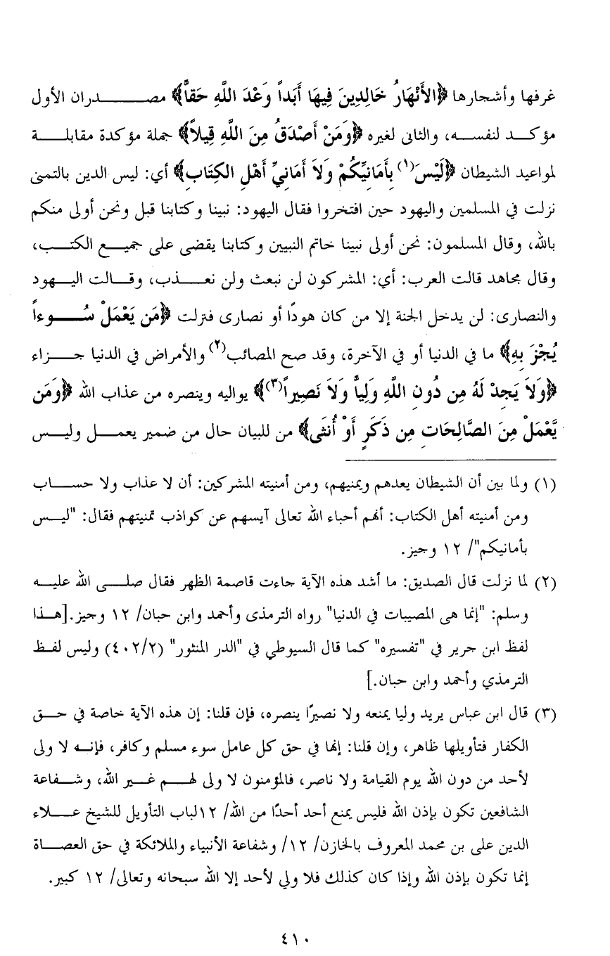 غرفها وأشجارها (الأَنْهَار خَالِدِينَ فِيهَا أَبَداً وَعْدَ اللهِ حَقًّا) مصدران الأول مؤكد لنفسه، والثاني لغيره (وَمَنْ أَصْدَقُ مِنَ اللهِ قِيلاً) جملة مؤكدة مقابلة لمواعيد الشيطان (لَيْسَ بِأَمَانِيِّكمْ وَلاَ أَمَانِيِّ أَهْلِ الكتَابِ) أي: ليس الدين بالتمني نزلت في المسلمين واليهود حين افتخروا فقال اليهود: نبينا وكتابنا قبل ونحن أولى منكم بالله، وقال المسلمون: نحن أولى نبينا خاتم النبيين وكتابنا يقضي على جممِع الكتب، وقال مجاهد قالت العرب: أي: المشركون لن نبعث ولن نعذب، وقالت اليهود والنصارى: لن يدخل الجنة إلا من كان هوداً أو نصارى فنزلت (مَن يَعْمَلْ سوءاً يُجْزَ بِهِ) إما في الدنيا أو في الآخرة، وقد صح المصائب والأمراض في الدنيا جزاء (وَلَا يَجِدْ لَهُ مِنْ دُونِ اللهِ وَلِيًّا وَلَا نَصِيرًا) يواليه وينصره من عذاب الله (وَمَنْ يَعْمَلْ مِنَ الصَّالِحَاتِ مِنْ ذَكَرٍ أَوْ أُنْثَى) من للبيان حال من ضمير يعمل وليس