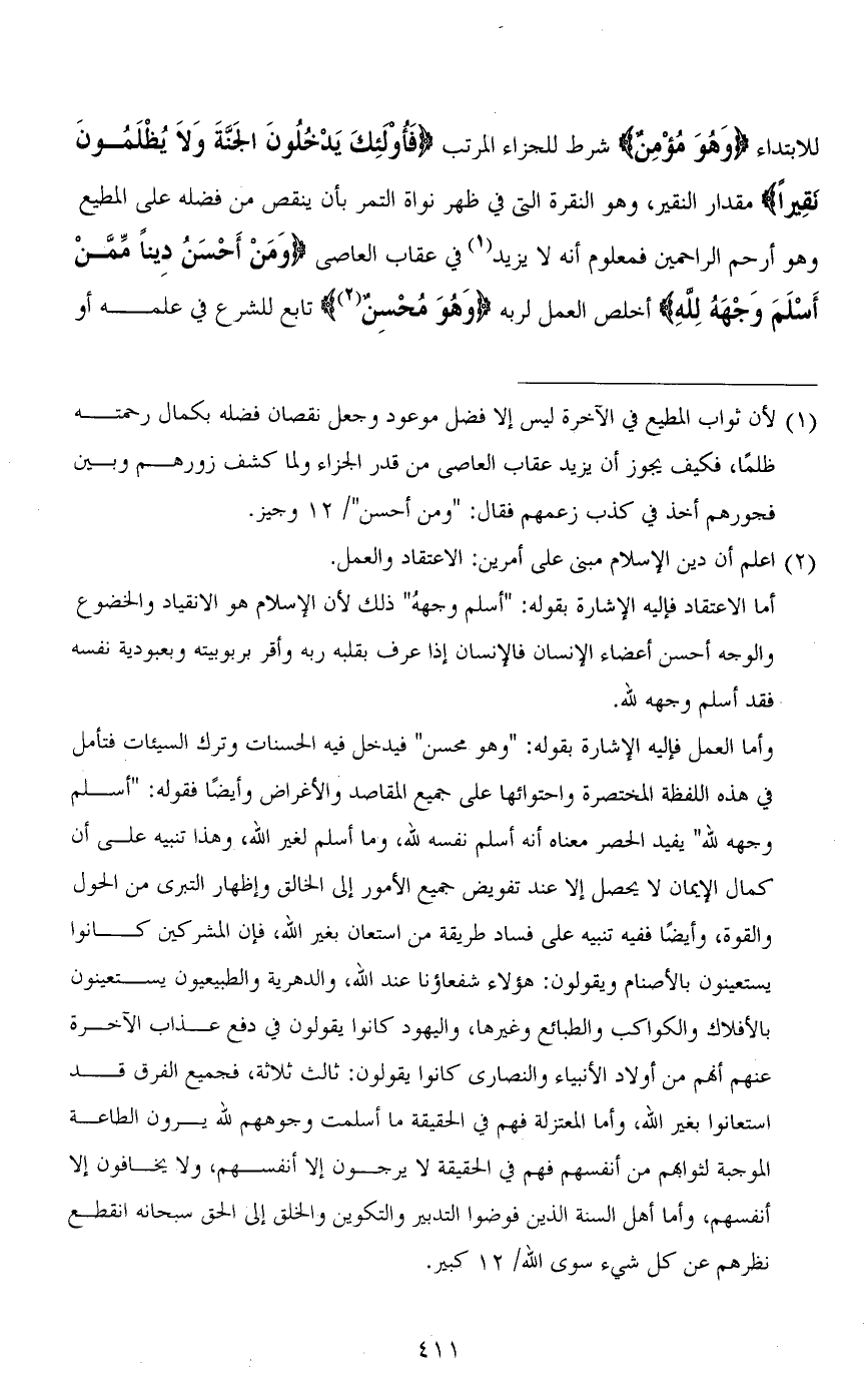 للابتداء (وَهُوَ مُؤْمِنٌ) شرط للجزاء المرتب (فَأُولَئِكَ يَدْخُلُونَ الْجَنَّةَ وَلَا يُظْلَمُونَ نَقِيرًا) مقدار النقير، وهو النقرة التي في ظهر نواة التمر بأن ينقص من فضله على المطيع وهو أرحم الراحمين فمعلوم أنه لا يزيد في عقاب العاصي (وَمَنْ أَحْسَنُ دِينًا مِمَّنْ أَسْلَمَ وَجْهَهُ لله) أخلص العمل لربه (وَهُوَ مُحْسِنٌ) تابع للشرع في علمه أو