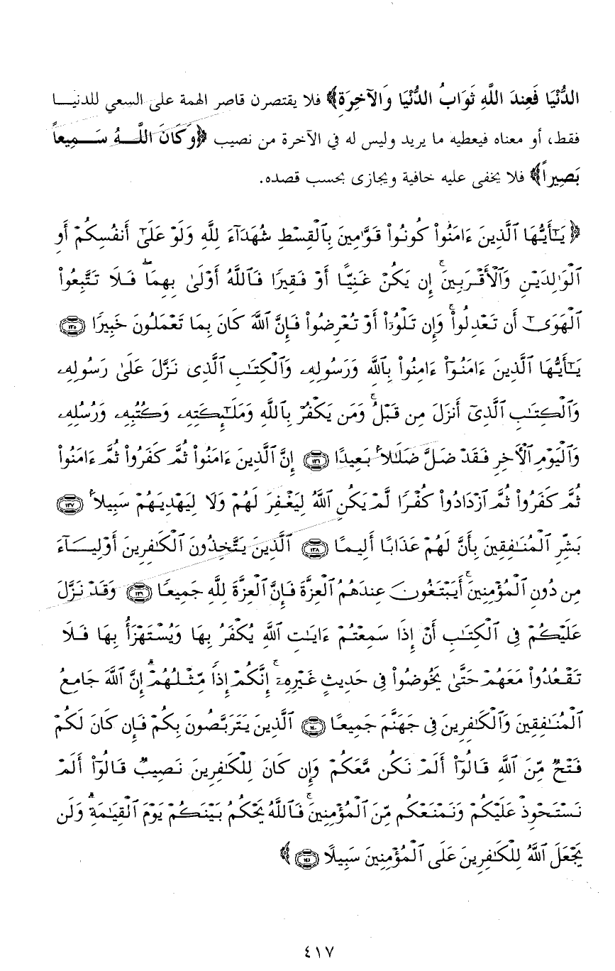 (يَا أَيُّهَا الَّذِينَ آمَنُوا كُونُوا قَوَّامِينَ بِالْقِسْطِ شُهَدَاءَ لله وَلَوْ عَلَى أَنْفُسِكُمْ أَوِ الْوَالِدَيْنِ وَالْأَقْرَبِينَ إِنْ يَكُنْ غَنِيًّا أَوْ فَقِيرًا فَاللهُ أَوْلَى بِهِمَا فَلَا تَتَّبِعُوا الْهَوَى أَنْ تَعْدِلُوا وَإِنْ تَلْوُوا أَوْ تُعْرِضُوا فَإِنَّ اللهَ كَانَ بِمَا تَعْمَلُونَ خَبِيرًا (135) يَا أَيُّهَا الَّذِينَ آمَنُوا آمِنُوا بِاللهِ وَرَسُولِهِ وَالْكِتَابِ الَّذِي نَزَّلَ عَلَى رَسُولِهِ وَالْكِتَابِ الَّذِي أَنْزَلَ مِنْ قَبْلُ وَمَنْ يَكْفُرْ بِاللهِ وَمَلَائِكَتِهِ وَكُتُبِهِ وَرُسُلِهِ وَالْيَوْمِ الْآخِرِ فَقَدْ ضَلَّ ضَلَالًا بَعِيدًا (136) إِنَّ الَّذِينَ آمَنُوا ثُمَّ كَفَرُوا ثُمَّ آمَنُوا ثُمَّ كَفَرُوا ثُمَّ ازْدَادُوا كُفْرًا لَمْ يَكُنِ اللهُ لِيَغْفِرَ لَهُمْ وَلَا لِيَهْدِيَهُمْ سَبِيلًا (137) بَشِّرِ الْمُنَافِقِينَ بِأَنَّ لَهُمْ عَذَابًا أَلِيمًا (138) الَّذِينَ يَتَّخِذُونَ الْكَافِرِينَ أَوْلِيَاءَ مِنْ دُونِ الْمُؤْمِنِينَ أَيَبْتَغُونَ عِنْدَهُمُ الْعِزَّةَ فَإِنَّ الْعِزَّةَ لله جَمِيعًا (139) وَقَدْ نَزَّلَ عَلَيْكُمْ فِي الْكِتَابِ أَنْ إِذَا سَمِعْتُمْ آيَاتِ اللهِ يُكْفَرُ بِهَا وَيُسْتَهْزَأُ بِهَا فَلَا تَقْعُدُوا مَعَهُمْ حَتَّى يَخُوضُوا فِي حَدِيثٍ غَيْرِهِ إِنَّكُمْ إِذًا مِثْلُهُمْ إِنَّ اللهَ جَامِعُ الْمُنَافِقِينَ وَالْكَافِرِينَ فِي جَهَنَّمَ جَمِيعًا (140) الَّذِينَ يَتَرَبَّصُونَ بِكُمْ فَإِنْ كَانَ لَكُمْ فَتْحٌ مِنَ اللهِ قَالُوا أَلَمْ نَكُنْ مَعَكُمْ وَإِنْ كَانَ لِلْكَافِرِينَ نَصِيبٌ قَالُوا أَلَمْ نَسْتَحْوِذْ عَلَيْكُمْ وَنَمْنَعْكُمْ مِنَ الْمُؤْمِنِينَ فَاللهُ يَحْكُمُ بَيْنَكُمْ يَوْمَ الْقِيَامَةِ وَلَنْ يَجْعَلَ اللهُ لِلْكَافِرِينَ عَلَى الْمُؤْمِنِينَ سَبِيلًا (141)
