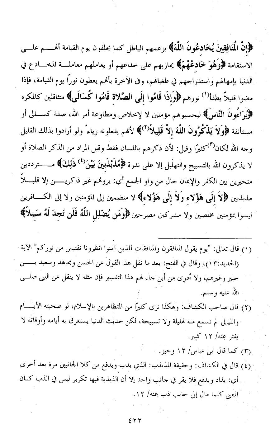 (إِنَّ الْمُنَافِقِينَ يُخَادِعُونَ اللهَ) بزعمهم الباطل كما يحلفون يوم القيامة أنَّهم على الاستقامة (وَهُوَ خَادِعُهُمْ) يجازيهم على خداعهم أو يعاملهم معاملة المخادع في الدنيا بإمهالهم واستدراجهم في طغيانهم، وفي الآخرة بأنهم يعطون نورًا يوم القيامة، فإذا مضوا قليلاً يطفأ نورهم (وَإِذَا قَامُوا إِلَى الصلاةِ قَامُوا كُسَالَى) متثاقلين كالمكره (يُرَاءُونَ النَّاسَ) ليحسبوهم مؤمنين لا لإخلاص ومطاوعة أمر الله، صفة كسالى أو مستأنفة (وَلَا يَذْكُرُونَ اللهَ إِلَّا قَلِيلًا) لأنَّهُم يفعلونه رياءً ولو أرادوا بذلك القليل وجه الله لكان كثيرًا وقيل: لأن ذكرهم باللسان فقط وقيل المراد من الذكر الصلاة أو لا يذكرون الله بالتسبيح والتهليل إلا على ندرة (مُذَبْذَبِينَ بَيْنَ ذَلِكَ) مترددين متحيرين بين الكفر والإيمان حال من واو الجمع أي: يرونهم غير ذاكرين إلا قليلاً مذبذبين (لاَ إِلَى هَؤُلاءِ وَلاَ إِلَى هَؤُلاءِ) لا منضمين إلى المؤمنين ولا إلى الكافرين ليسوا بمؤمنين مخلصين ولا مشركين مصرحين (وَمَن يُضْلِلِ اللهُ فَلَن تَجِدَ لَهُ سَبِيلاً)