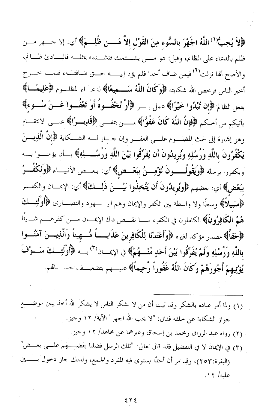 (لاَ يُحِبُّ اللهُ الجَهْرَ بِالسُّوءِ مِنَ القَوْلِ إِلَّا مَن ظُلِمَ) أي: إلا جهر من ظلم بالدعاء على الظالم، وقيل: هو من يشتمك فتشتمه بمثله فالبادئ ظالم، والأصح أنها نزلت فيمن ضاف أحدًا فلم يؤد إليه حق ضيافته، فلما خرج أخبر الناس فرخص الله شكايته (وَكَان اللهُ سَمِيعًا) لدعاء المظلوم (عَلِيمًا) بفعل الظالم (إِن تُبْدُوا خيْرًا) عمل بر (أَوْ تُحفُوهُ أَوْ تَعْفُوا عَنْ سُوءٍ) يأتيكم من أخيكم (فَإِنَّ اللهَ كَانَ عَفُوًّا) لمن عفى (قَدِيرًا) على الانتقام وهو إشارة إلى حثِّ المظلوم على العفو وإن جاز له الشكاية (إِنَّ الَّذِينَ يَكْفُرُونَ بِاللهِ وَرُسُلِهِ وَيُرِيدُونَ أَنْ يُفَرِّقُوا بَيْنَ اللهِ وَرُسُلِهِ) بأن يؤمنوا به ويكفروا برسله (وَيَقُولُونَ نُؤْمِنُ بِبَعْضٍ) أي: ببعض الأنبياء (وَنَكْفُرُ بِبَعْضٍ) أي: بعضهم (وَيُرِيدُونَ أَنْ يَتَّخِذُوا بَيْنَ ذَلِكَ) أي: الإيمان والكفر (سَبِيلًا) وسطًا ولا واسطة بين الكفر والإيمان وهم اليهود والنصارى (أُولئِك هُمُ الكَافرُونَ) الكاملون في الكفر، ما نقص ذاك الإيمان من كفرهم شيئًا (حَقًّا) مصدر مؤكد لغيره (وَأَعْتَدنا لِلْكَافِرِينَ عَذَاباً مُّهِيناً وَالَّذِينَ آمَنُوا بِاللهِ وَرُسُلِهِ وَلَمْ يُفَرِّقُوا بَيْنَ أَحَدٍ منْهُمْ) في الإيمان به (أُولَئِكَ سَوْفَ يُؤْتِيهِمْ أُجُورَهُمْ وَكَانَ اللهُ عفُوراً رّحِيماً) عليهم بتضعيف حسناتهم.