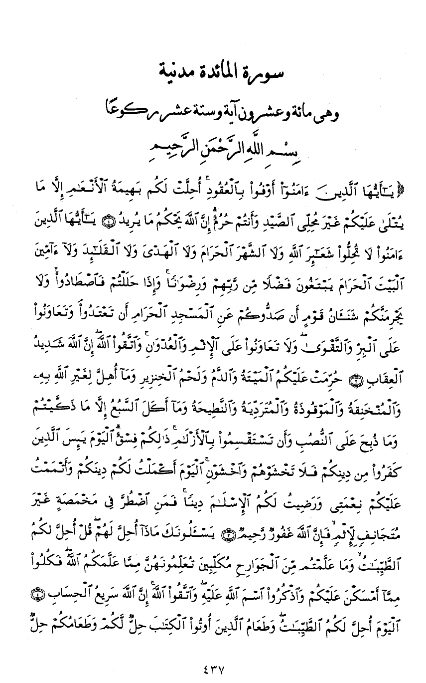 (يَا أَيُّهَا الَّذِينَ آمَنُوا أَوْفُوا بِالْعُقُودِ أُحِلَّتْ لَكُمْ بَهِيمَةُ الْأَنْعَامِ إِلَّا مَا يُتْلَى عَلَيْكُمْ غَيْرَ مُحِلِّي الصَّيْدِ وَأَنْتُمْ حُرُمٌ إِنَّ اللهَ يَحْكُمُ مَا يُرِيدُ (1) يَا أَيُّهَا الَّذِينَ آمَنُوا لَا تُحِلُّوا شَعَائِرَ اللهِ وَلَا الشَّهْرَ الْحَرَامَ وَلَا الْهَدْيَ وَلَا الْقَلَائِدَ وَلَا آمِّينَ الْبَيْتَ الْحَرَامَ يَبْتَغُونَ فَضْلًا مِنْ رَبِّهِمْ وَرِضْوَانًا وَإِذَا حَلَلْتُمْ فَاصْطَادُوا وَلَا يَجْرِمَنَّكُمْ شَنَئَانُ قَوْمٍ أَنْ صَدُّوكُمْ عَنِ الْمَسْجِدِ الْحَرَامِ أَنْ تَعْتَدُوا وَتَعَاوَنُوا عَلَى الْبِرِّ وَالتَّقْوَى وَلَا تَعَاوَنُوا عَلَى الْإِثْمِ وَالْعُدْوَانِ وَاتَّقُوا اللهَ إِنَّ اللهَ شَدِيدُ الْعِقَابِ (2) حُرِّمَتْ عَلَيْكُمُ الْمَيْتَةُ وَالدَّمُ وَلَحْمُ الْخِنْزِيرِ وَمَا أُهِلَّ لِغَيْرِ اللهِ بِهِ وَالْمُنْخَنِقَةُ وَالْمَوْقُوذَةُ وَالْمُتَرَدِّيَةُ وَالنَّطِيحَةُ وَمَا أَكَلَ السَّبُعُ إِلَّا مَا ذَكَّيْتُمْ وَمَا ذُبِحَ عَلَى النُّصُبِ وَأَنْ تَسْتَقْسِمُوا بِالْأَزْلَامِ ذَلِكُمْ فِسْقٌ الْيَوْمَ يَئِسَ الَّذِينَ كَفَرُوا مِنْ دِينِكُمْ فَلَا تَخْشَوْهُمْ وَاخْشَوْنِ الْيَوْمَ أَكْمَلْتُ لَكُمْ دِينَكُمْ وَأَتْمَمْتُ عَلَيْكُمْ نِعْمَتِي وَرَضِيتُ لَكُمُ الْإِسْلَامَ دِينًا فَمَنِ اضْطُرَّ فِي مَخْمَصَةٍ غَيْرَ مُتَجَانِفٍ لِإِثْمٍ فَإِنَّ اللهَ غَفُورٌ رَحِيمٌ (3) يَسْأَلُونَكَ مَاذَا أُحِلَّ لَهُمْ قُلْ أُحِلَّ لَكُمُ الطَّيِّبَاتُ وَمَا عَلَّمْتُمْ مِنَ الْجَوَارِحِ مُكَلِّبِينَ تُعَلِّمُونَهُنَّ مِمَّا عَلَّمَكُمُ اللهُ فَكُلُوا مِمَّا أَمْسَكْنَ عَلَيْكُمْ وَاذْكُرُوا اسْمَ اللهِ عَلَيْهِ وَاتَّقُوا اللهَ إِنَّ اللهَ سَرِيعُ الْحِسَابِ (4) الْيَوْمَ أُحِلَّ لَكُمُ الطَّيِّبَاتُ وَطَعَامُ الَّذِينَ أُوتُوا الْكِتَابَ حِلٌّ لَكُمْ وَطَعَامُكُمْ