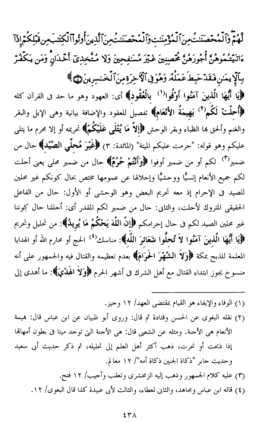 (يَا أَيُّهَا الَّذِينَ آمنوا أَوْفُوا بِالْعُقُودِ) أي: العهود وهو ما حد في القرآن كله (أُحِلَّتْ لَكُمْ بَهِيمَةُ الْأَنْعَامِ) تفصيل للعقود والإضافة بيانية وهي الإبل والبقر والغنم وألحق بها الظباء وبقر الوحش (إِلَّا مَا يُتْلَى عَلَيْكُمْ) تحريمه أو إلا محرم ما يتلى عليكم وهو قوله: " حرمت عليكم الميتة " [المائدة: 3] (غَيْرَ مُحِلِّي الصَّيْدِ) حال من ضمير لكم أو من ضمير أوفوا (وَأَنْتُمْ حُرُمٌ) حال من ضمير محلي يعني أحلت لكم جميع الأنعام إنسيًّا ووحشيًّا وإحلالها عن عمومها مختص بحال كونكم غير محلين للصيد في الإحرام إذ معه تحريم البعض وهو الوحشي أو الاول: حال من الفاعل الحقيقي المتروك لأحلت، والثاني: حال من ضمير لكم المقدر أي: أحللنا حال كوننا غير محلين الصيد لكم في حال إحرامكم (إِنَّ اللهَ يَحْكُمُ مَا يُرِيدُ): من تحليل وتحريم (يَا أَيُّهَا الَّذِينَ آمَنُوا لاَ تُحِلُّوا شَعَائِرَ اللهِ): مناسك الحج أو محارم الله أو الهدايا المعلمة للذبح بمكة (وَلاَ الشَّهْرَ الحَرَامَ) بعدم تعظيمه والقتال فيه والجمهور على أنه منسوخ يجوز ابتداء القتال مع أهل الشرك في أشهر الحرم (وَلاَ الهَدْيَ): ما أهدي إلى