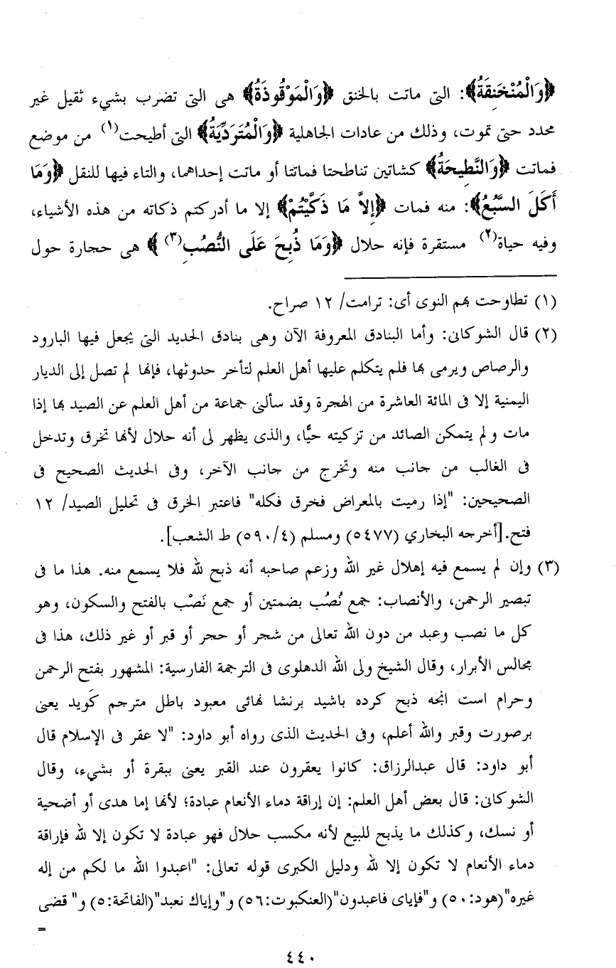 (وَالْمُنْخَنِقَةُ): التي ماتت بالخنق (وَالْمَوْقُوذَةُ) هي التي تضرب بشيء ثقيل غير محدد حتى تموت، وذلك من عادات الجاهلية (وَالْمُتَرَدِّيَةُ) التي أطيحت من موضع فماتت (وَالنَّطِيحَةُ) كشاتين تناطحتا فماتتا أو ماتت إحداهما، والتاء فيها للنقل (وَمَا أَكَلَ السَّبُعُ). منه فمات (إِلَّا مَا ذَكَّيْتُمْ) إلا ما أدركتم ذكاته من هذه الأشياء، وفيه حياة مستقرة فإنه حلال (وَمَا ذُبِحَ عَلَى النُّصُبِ) هي حجارة حول