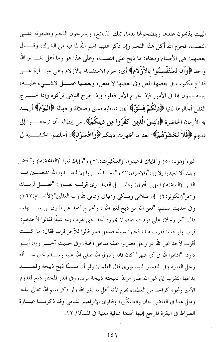 البيت يذبحون عندها وينضحونها بدماء تلك الذبائح، ويشرحون اللحم ويضعونه على النصب، فحرم الله أكل هذا اللحم وإن ذكر عليها اسم الله لما فيه من الشرك، وقال بعضهم: هي الأصنام ومعناه: ما ذبح على النصب، وعلى هذا هو وما أهل لغير الله واحد (وَأَنْ تَسْتَقْسِمُوا بِالْأَزْلَامِ) أي: حرم الاستقسام بالأزلام وهي عبارة عن قداح مكتوب في بعضها افعل وفي بعضها لا تفعل، وبعضها غفل لا شيء عليه، يستقسمون بها في الأمور فإذا خرج الأمر فعلوه وإذا خرج الناهي تركوه وإذا خرج الغفل أجالوها ثانيًا (ذَلِكُمْ فِسْقٌ) أي: تعاطيه فسق وضلالة وجهالة (اليَوْمَ) أريد به الأزمان الحاضرة (يَئِسَ الَّذِينَ كَفَرُوا مِنْ دِينِكُمْ): من إبطاله بأن ترجعوا إلى دينهم (فَلَا تَخْشَوْهُمْ): بعد ما أظهرت دينكم (وَاخْشَوْنِ): أخلصوا الخشية لي