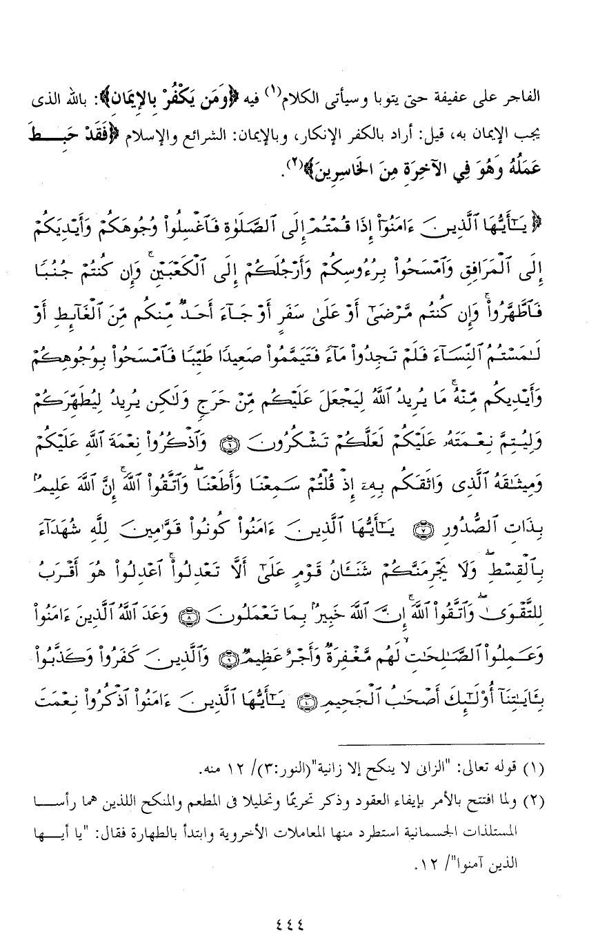 (يَا أَيُّهَا الَّذِينَ آمَنُوا إِذَا قُمْتُمْ إِلَى الصَّلَاةِ فَاغْسِلُوا وُجُوهَكُمْ وَأَيْدِيَكُمْ إِلَى الْمَرَافِقِ وَامْسَحُوا بِرُءُوسِكُمْ وَأَرْجُلَكُمْ إِلَى الْكَعْبَيْنِ وَإِنْ كُنْتُمْ جُنُبًا فَاطَّهَّرُوا وَإِنْ كُنْتُمْ مَرْضَى أَوْ عَلَى سَفَرٍ أَوْ جَاءَ أَحَدٌ مِنْكُمْ مِنَ الْغَائِطِ أَوْ لَامَسْتُمُ النِّسَاءَ فَلَمْ تَجِدُوا مَاءً فَتَيَمَّمُوا صَعِيدًا طَيِّبًا فَامْسَحُوا بِوُجُوهِكُمْ وَأَيْدِيكُمْ مِنْهُ مَا يُرِيدُ اللهُ لِيَجْعَلَ عَلَيْكُمْ مِنْ حَرَجٍ وَلَكِنْ يُرِيدُ لِيُطَهِّرَكُمْ وَلِيُتِمَّ نِعْمَتَهُ عَلَيْكُمْ لَعَلَّكُمْ تَشْكُرُونَ (6) وَاذْكُرُوا نِعْمَةَ اللهِ عَلَيْكُمْ وَمِيثَاقَهُ الَّذِي وَاثَقَكُمْ بِهِ إِذْ قُلْتُمْ سَمِعْنَا وَأَطَعْنَا وَاتَّقُوا اللهَ إِنَّ اللهَ عَلِيمٌ بِذَاتِ الصُّدُورِ (7) يَا أَيُّهَا الَّذِينَ آمَنُوا كُونُوا قَوَّامِينَ لله شُهَدَاءَ بِالْقِسْطِ وَلَا يَجْرِمَنَّكُمْ شَنَئَانُ قَوْمٍ عَلَى أَلَّا تَعْدِلُوا اعْدِلُوا هُوَ أَقْرَبُ لِلتَّقْوَى وَاتَّقُوا اللهَ إِنَّ اللهَ خَبِيرٌ بِمَا تَعْمَلُونَ (8) وَعَدَ اللهُ الَّذِينَ آمَنُوا وَعَمِلُوا الصَّالِحَاتِ لَهُمْ مَغْفِرَةٌ وَأَجْرٌ عَظِيمٌ (9) وَالَّذِينَ كَفَرُوا وَكَذَّبُوا بِآيَاتِنَا أُولَئِكَ أَصْحَابُ الْجَحِيمِ (10) يَا أَيُّهَا الَّذِينَ آمَنُوا اذْكُرُوا