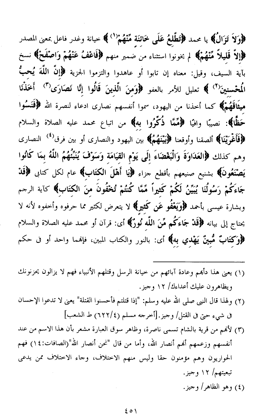 (وَلَا تَزَالُ) يا محمد (تَطَّلِعُ عَلَى خَائِنَةٍ مِنْهُمْ) خيانة وغدر فاعل بمعنى المصدر (إِلَّا قَلِيلًا مِنْهُمْ) " لم يخونوا استثناء من ضمير منهم (فَاعْفُ عَنْهُمْ وَاصْفَحْ) نسخ باية السيف، وقيل: معناه إن تابوا أو عا@دوا والضزموا الجزية (إِنَّ اللهَ يُحِبُّ الْمُحْسِنِينَ) تعليل للأمر بالعفو (وَمِنَ الَّذِينَ قَالُوا إِنَّا نَصَارَى أَخَذْنَا مِيثَاقَهُمْ) كما أخذنا من اليهود، سموا أنفسهم نصارى ادعاء لنصرة الله (فَنَسُوا حَظًّا): نصيبًا وافيًا (مِمَّا ذُكِّرُوا بِهِ) من اتباع محمد عليه الصلاة والسلام (فَأَغْرَيْنَا) ألصقنا وأوقعنا (بَيْنَهُمُ) بين اليهود والنصارى أو بين فرق النصارى وهم كذلك (الْعَدَاوَةَ وَالْبَغْضَاءَ إِلَى يَوْمِ الْقِيَامَةِ وَسَوْفَ يُنَبِّئُهُمُ اللهُ بِمَا كَانُوا يَصْنَعُونَ) بشنيع صنيعهم بأقطع جزاء (يَا أَهلَ الْكِتَابِ) عام لكل كتابي (قَدْ جَاءَكُمْ رَسُولُنَا يُبَيِّنُ لَكُمْ كَثِيرًا مِمَّا كُنْتُمْ تُخْفُونَ مِنَ الْكِتَابِ) كآية الرجم وبشارة عيسى بأحمد (وَيَعْفُو عَنْ كَثِيرٍ) لا يتعرض لكثير مما حرفوه وأخفوه لأنه لا يحتاج إلى بيانه (قَدْ جَاءَكُمْ مِنَ اللهِ نُورٌ) أي: قرآن أو محمد عليه الصلاة والسلام (وَكِتَابٌ مُبِينٌ يَهْدِي بِهِ اللهُ) أي: بالنور والكتاب المبين، فإنهما واحد أو في حكم