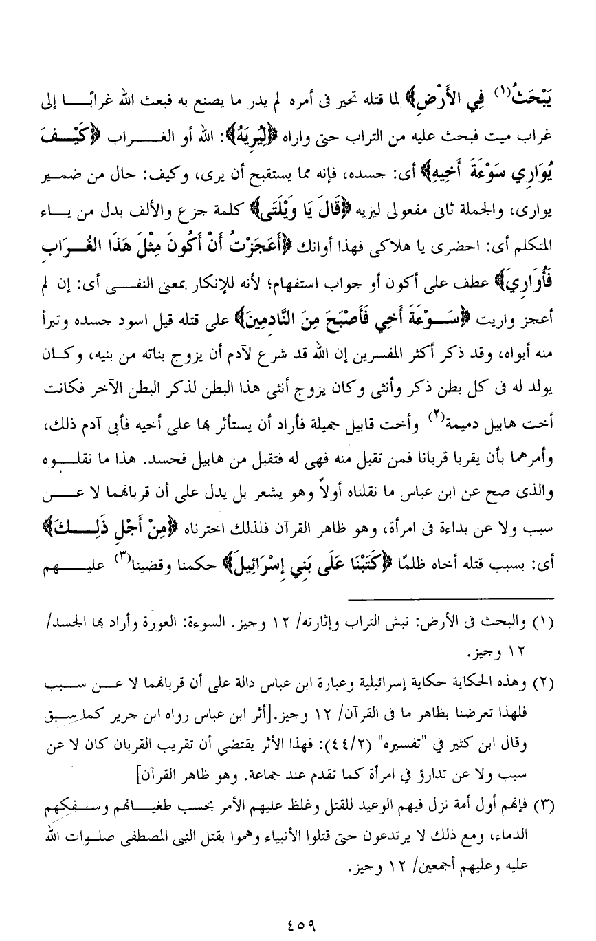 يَبْحَثُ فِي الْأَرْضِ) لما قتله تحير في أمره لم يدر ما يصنع به فبعث الله غرابًا إلى غراب ميت فبحث عليه من التراب حتى واراه (لِيُرِيَهُ): الله أو الغراب (كَيْفَ يُوَارِي سَوْءَةَ أَخِيهِ) أي: جسده، فإنه مما يستقبح أن يرى، وكيف: حال من ضمير يواري، والجملة ثاني مفعولي (لِيُرِيَهُ) (قَالَ يَا وَيْلَتَى) كلمة جزع والألف بدل من ياء المتكلم أي: احضري يا هلاكى فهذا أوانك (أَعَجَزْتُ أَنْ أَكُونَ مِثْلَ هَذَا الْغُرَابِ فَأُوَارِيَ) عطف على أكون أو جواب استفهام؛ لأنه للإنكار بمعنى النفي أي: إن لم أعجز واريت (سَوْءَةَ أَخِي فَأَصْبَحَ مِنَ النَّادِمِينَ) على قتله قيل اسود جسده وتبرأ منه أبواه، وقد ذكر أكثر المفسرين إن الله قد شرع لآدم أن يزوج بناته من بنيه، وكان يولد له في كل بطن ذكر وأنثى وكان يزوج أنثى هذا البطن لذكر البطن الآخر فكانت أخت هابيل دميمة وأخت قابيل جميلة فأراد أن يستأثر بها على أخيه فأبى آدم ذلك، وأمرهما بأن يقربا قربانًا فمن تقبل منه فهي له فتقبل من هابيل فحسد. هذا ما نقلوه والذي صح عن ابن عباس ما نقلناه أولاً وهو يشعر بل يدل على أن قربانهما لا عن سبب ولا عن بداءة في امرأة، وهو ظاهر القرآن فلذلك اخترناه (مِنْ أَجْلِ ذلِكَ) أي: بسبب قتله أخاه ظلمًا (كَتَبْنَا عَلَى بَنِي إِسْرَائِيلَ) حكمنا وقضينا عليهم
