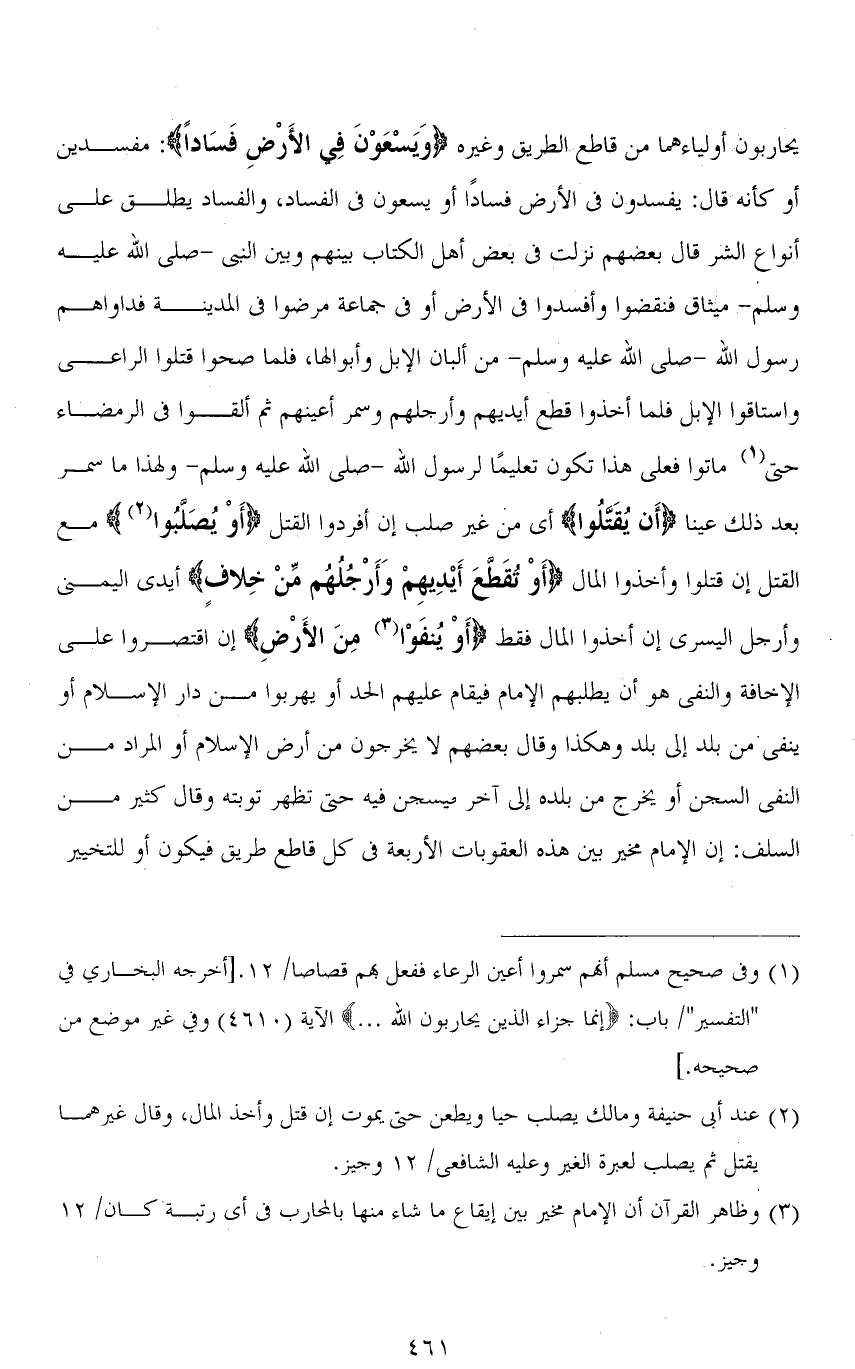 يحاربون أولياءهما من قاطع الطريق وغيره (وَيَسْعَوْنَ فِي الْأَرْضِ فَسَادًا): مفسدين أو كأنه قال: يفسدون في الأرض فسادًا أو يسعون في الفساد، والفساد يطلق على أنواع الشر قال بعضهم نزلت في بعض أهل الكتاب بينهم وبين النبي - صلى الله عليه وسلم - ميثاق فنقضوا وأفسدوا في الأرض أو في جماعة مرضوا في المدينة فداواهم رسول الله - صلى الله عليه وسلم - من ألبان الإبل وأبوالها، فلما صحوا قتلوا الراعي واستاقوا الإبل فلما أخذوا قطع أيديهم وأرجلهم وسمر أعينهم ثم ألقوا في الرمضاء حتى ماتوا فعلى هذا تكون تعليمًا لرسول الله - صلى الله عليه وسلم - ولهذا ما سمر بعد ذلك عينًا (أَنْ يُقَتَّلُوا) أي من غير صلب إن أفردوا القتل (أَوْ يُصَلَّبُوا) مع القتل إن قتلوا وأخذوا المال (أَوْ تُقَطَّعَ أَيْدِيهِمْ وَأَرْجُلُهُمْ مِنْ خِلَافٍ) أيدي اليمنى وأرجل اليسرى إن أخذوا المال فقط (أَوْ يُنْفَوْا مِنَ الْأَرْضِ) إن اقتصروا على الإخافة والنفي هو أن يطلبهم الإمام فيقام عليهم الحد أو يهربوا من دار الإسلام أو ينفى من بلد إلى بلد وهكذا وقال بعضهم لا يخرجون من أرض الإسلام أو المراد من النفي السجن أو يخرج من بلده إلى آخر فيسجن فيه حتى تظهر توبته وقال كثير من السلف: إن الإمام مخير بين هذه العقوبات الأربعة في كل قاطع طريق فيكون أو للتخيير