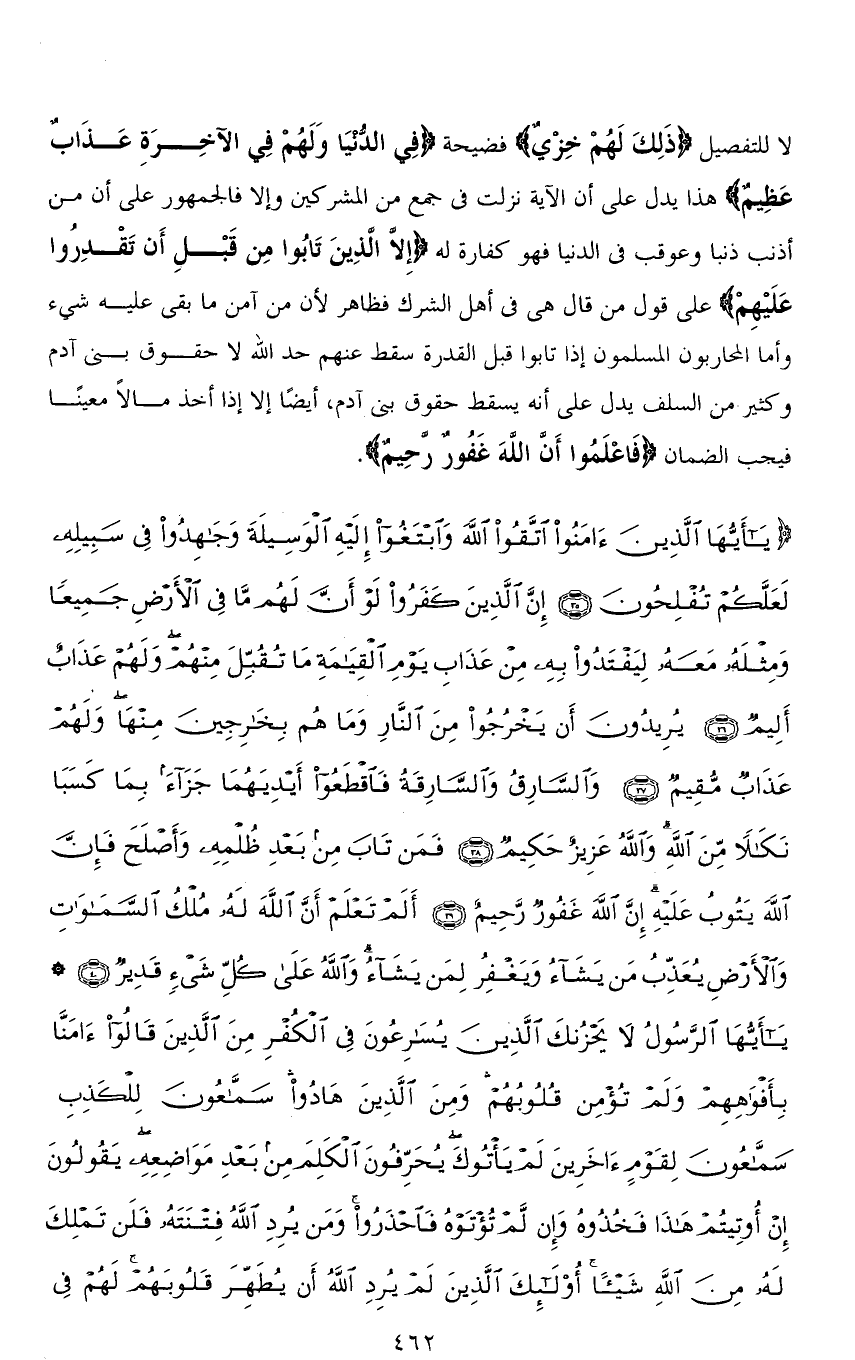 (يَا أَيُّهَا الَّذِينَ آمَنُوا اتَّقُوا اللهَ وَابْتَغُوا إِلَيْهِ الْوَسِيلَةَ وَجَاهِدُوا فِي سَبِيلِهِ لَعَلَّكُمْ تُفْلِحُونَ (35) إِنَّ الَّذِينَ كَفَرُوا لَوْ أَنَّ لَهُمْ مَا فِي الْأَرْضِ جَمِيعًا وَمِثْلَهُ مَعَهُ لِيَفْتَدُوا بِهِ مِنْ عَذَابِ يَوْمِ الْقِيَامَةِ مَا تُقُبِّلَ مِنْهُمْ وَلَهُمْ عَذَابٌ أَلِيمٌ (36) يُرِيدُونَ أَنْ يَخْرُجُوا مِنَ النَّارِ وَمَا هُمْ بِخَارِجِينَ مِنْهَا وَلَهُمْ عَذَابٌ مُقِيمٌ (37) وَالسَّارِقُ وَالسَّارِقَةُ فَاقْطَعُوا أَيْدِيَهُمَا جَزَاءً بِمَا كَسَبَا نَكَالًا مِنَ اللهِ وَاللهُ عَزِيزٌ حَكِيمٌ (38) فَمَنْ تَابَ مِنْ بَعْدِ ظُلْمِهِ وَأَصْلَحَ فَإِنَّ اللهَ يَتُوبُ عَلَيْهِ إِنَّ اللهَ غَفُورٌ رَحِيمٌ (39) أَلَمْ تَعْلَمْ أَنَّ اللهَ لَهُ مُلْكُ السَّمَاوَاتِ وَالْأَرْضِ يُعَذِّبُ مَنْ يَشَاءُ وَيَغْفِرُ لِمَنْ يَشَاءُ وَاللهُ عَلَى كُلِّ شَيْءٍ قَدِيرٌ (40) يَا أَيُّهَا الرَّسُولُ لَا يَحْزُنْكَ الَّذِينَ يُسَارِعُونَ فِي الْكُفْرِ مِنَ الَّذِينَ قَالُوا آمَنَّا بِأَفْوَاهِهِمْ وَلَمْ تُؤْمِنْ قُلُوبُهُمْ وَمِنَ الَّذِينَ هَادُوا سَمَّاعُونَ لِلْكَذِبِ سَمَّاعُونَ لِقَوْمٍ آخَرِينَ لَمْ يَأْتُوكَ يُحَرِّفُونَ الْكَلِمَ مِنْ بَعْدِ مَوَاضِعِهِ يَقُولُونَ إِنْ أُوتِيتُمْ هَذَا فَخُذُوهُ وَإِنْ لَمْ تُؤْتَوْهُ فَاحْذَرُوا وَمَنْ يُرِدِ اللهُ فِتْنَتَهُ فَلَنْ تَمْلِكَ لَهُ مِنَ اللهِ شَيْئًا أُولَئِكَ الَّذِينَ لَمْ يُرِدِ اللهُ أَنْ يُطَهِّرَ قُلُوبَهُمْ لَهُمْ فِي