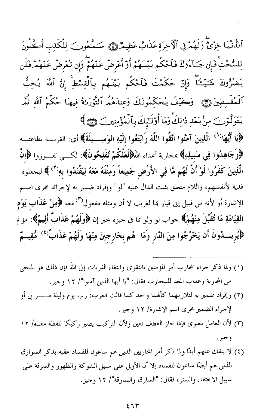 الدُّنْيَا خِزْيٌ وَلَهُمْ فِي الْآخِرَةِ عَذَابٌ عَظِيمٌ (41) سَمَّاعُونَ لِلْكَذِبِ أَكَّالُونَ لِلسُّحْتِ فَإِنْ جَاءُوكَ فَاحْكُمْ بَيْنَهُمْ أَوْ أَعْرِضْ عَنْهُمْ وَإِنْ تُعْرِضْ عَنْهُمْ فَلَنْ يَضُرُّوكَ شَيْئًا وَإِنْ حَكَمْتَ فَاحْكُمْ بَيْنَهُمْ بِالْقِسْطِ إِنَّ اللهَ يُحِبُّ الْمُقْسِطِينَ (42) وَكَيْفَ يُحَكِّمُونَكَ وَعِنْدَهُمُ التَّوْرَاةُ فِيهَا حُكْمُ اللهِ ثُمَّ يَتَوَلَّوْنَ مِنْ بَعْدِ ذَلِكَ وَمَا أُولَئِكَ بِالْمُؤْمِنِينَ (43)