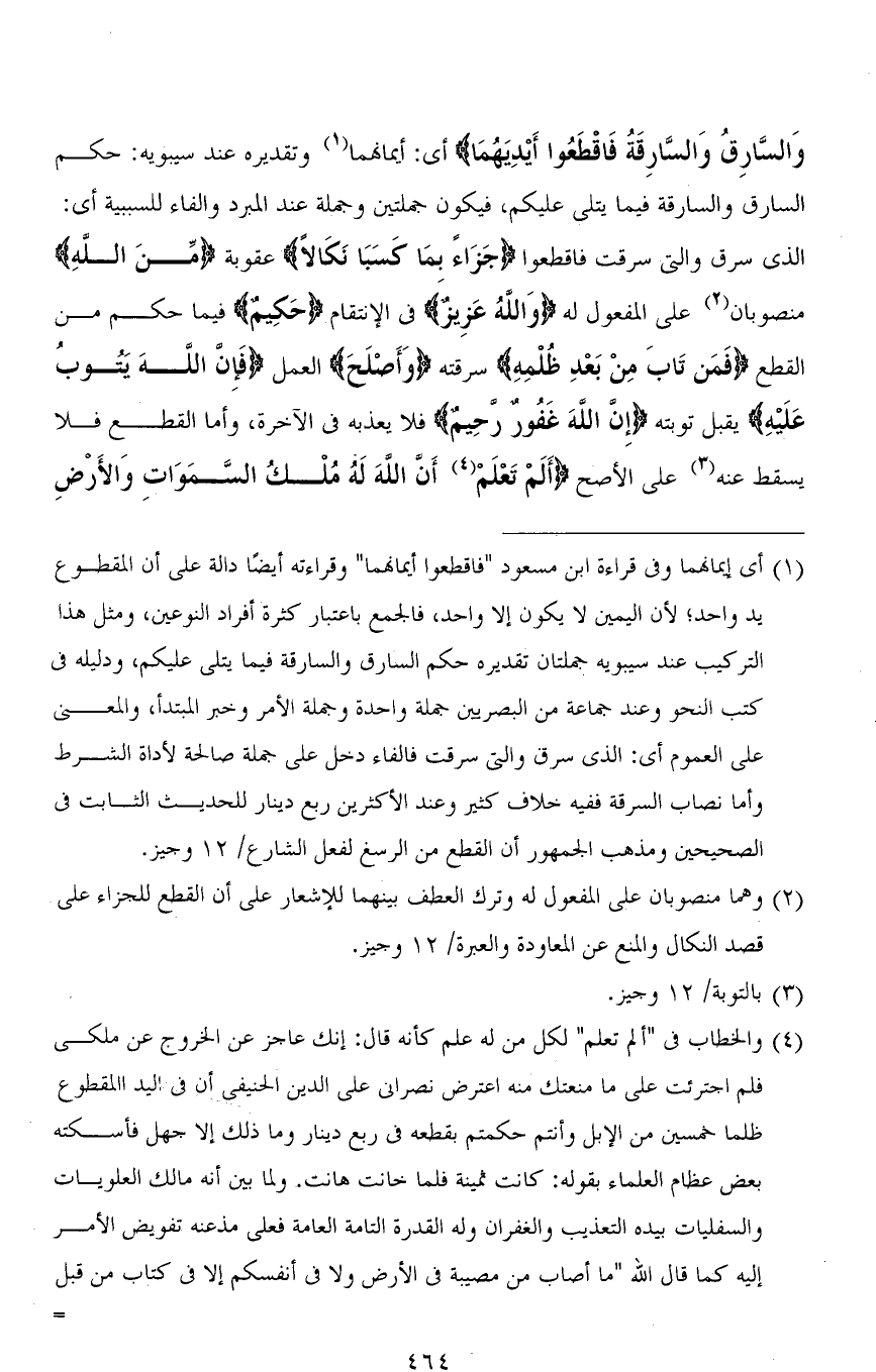 وَالسَّارِقُ وَالسَّارِقَةُ فَاقْطَعُوا أَيْدِيَهُمَا) أي: أيمانهما وتقديره عند سيبويه: حكم السارق والسارقة فيما يتلى عليكم، فيكون جملتين وجملة عند المبرد والفاء للسببية أي: الذي سرق والتي سرقت فاقطعوا (جَزَاء بمَا كَسَبَا نَكَالاً) عقوبة (مِّنَ اللهِ) منصوبان على المفعول له (وَاللهُ عَزِيزٌ) في الإنتقام (حَكِيمٌ) فيما حكم من القطع (فَمَن تَابَ مِنْ بَعْدِ ظُلْمِهِ) سرقته (وَأَصْلَحَ) العمل (فَإِنَّ اللهَ يَتُوبُ عَلَيْهِ) يقبل توبته (إِنْ الله غَفُورٌ رحِيمٌ) فلا يعذبه في الآخرة، وأما القطع فلا يسقط عنه على الأصح (أَلَمْ تَعْلَمْ أَنَّ اللهَ لَهُ مُلْكُ السَّمَاوَاتِ وَالْأَرْضِ