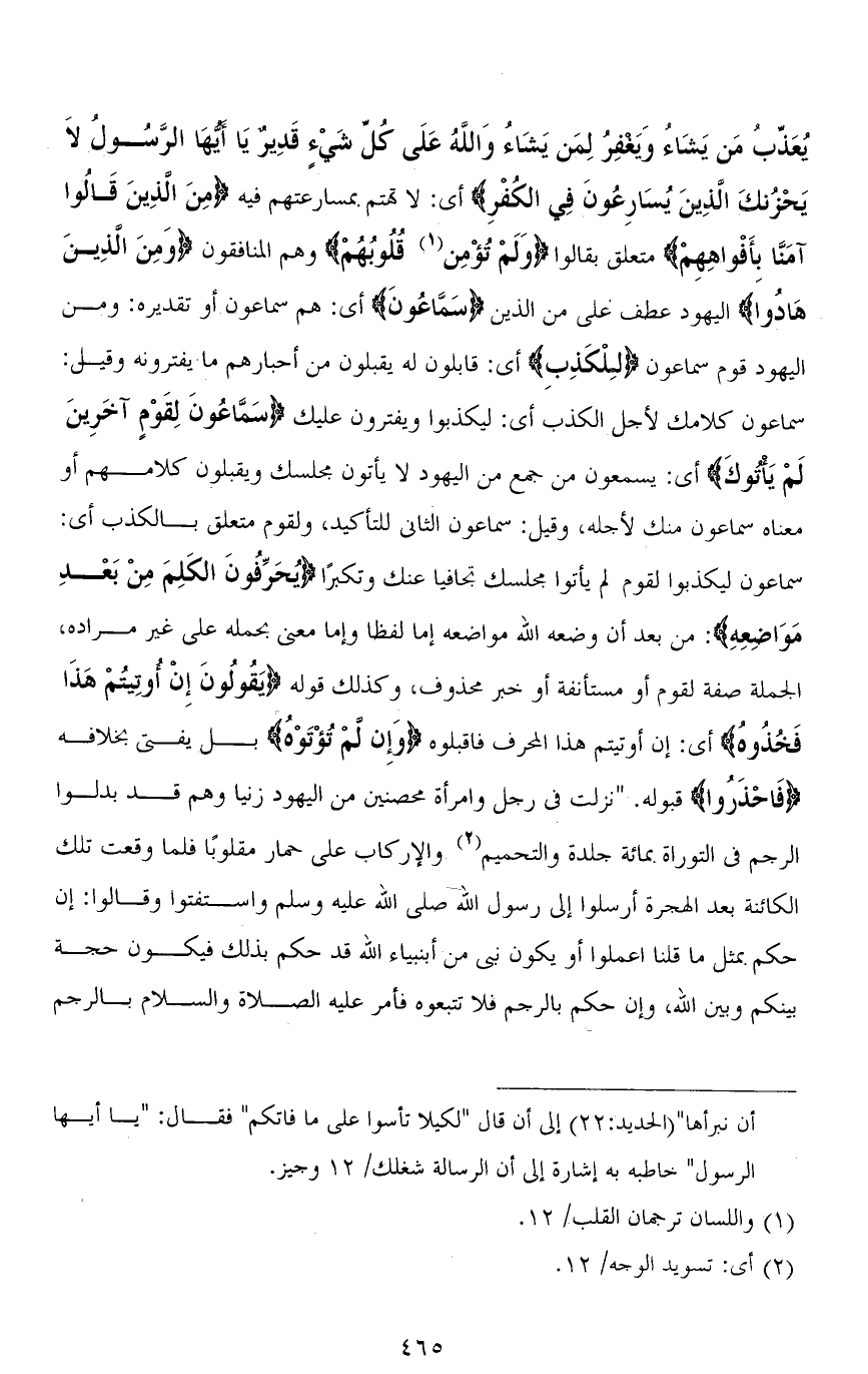 يُعَذِّبُ مَنْ يَشَاءُ وَيَغْفِرُ لِمَنْ يَشَاءُ وَاللهُ عَلَى كُلِّ شَيْءٍ قَدِيرٌ (40) يَا أَيُّهَا الرَّسُولُ لَا يَحْزُنْكَ الَّذِينَ يُسَارِعُونَ فِي الْكُفْرِ) أي: لا تهتم بمسارعَّتَهم فيه (مِنَ الَّذِينَ قَالوا آمَنَّا بِأَفْواهِهِمْ) متعلق بقالوا (وَلَمْ تُؤْمِن قُلُوبُهُمْ) وهم المنافقون (وَمِنَ الَّذِينَ هَادُوا) اليهود عطف على من الذين (سَمَّاعُونَ) أي: هم سَمَّاعُونَ أو تقديره: ومن اليهود قوم سَمَّاعُونَ (لِلْكَذِبِ) أي: قابلون له يقبلون من أحبارهم ما يفترونه وقيل: سَمَّاعُونَ كلامك لأجل الكذب أي: ليكذبوا ويفترون عليك (سَمَّاعُونَ لِقَوْمٍ آخَرِينَ لَمْ يَأْتُوكَ) أي: يسمعون من جمع من اليهود لا يأتون مجلسك ويقبلون كلامهم أو معناه سَمَّاعُونَ منك لأجله، وقيل: سَمَّاعُونَ الثاني للتأكيد، ولقوم متعلق بالكذب أي: سَمَّاعُونَ ليكذبوا لقوم لم يأتوا مجلسك تجافيًا عنك وتكبرًا (يُحَرِّفُونَ الكلِمَ مِنْ بَعْدِ مَوَاضِعِهِ): من بعد أن وضعه الله مواضعه إما لفظًا وإما معنى بحمله على غير مراده، الجملة صفة لقوم أو مستأنفة أو خبر محذوف، وكذلك قوله (يَقُولُونَ إِنْ أُوتِيتُمْ هَذَا فَخُذُوهُ) أي: إن أوتيتم هذا المحرف فاقبلوه (وَإِنْ لَمْ تُؤْتَوْهُ) بل يفتى بخلافه (فَاحْذَرُوا) قبوله. " نزلت في رجل وامرأة محصنين من اليهود زنيا وهم قد بدلوا الرجم في التوراة بمائة جلدة والتحميم والإركاب على حمار مقلوبًا فلما وقعت تلك الكائنة بعد الهجرة أرسلوا إلى رسول الله صلى الله عليه وسلم واستفتوا وقالوا: إن حكم بمثل ما قلنا اعملوا أو يكون نبي من أنبياء الله قد حكم بذلك فيكون حجة بينكم وبين الله، وإن حكم بالرجم فلا تتبعوه فأمر عليه الصلاة والسلام بالرجم