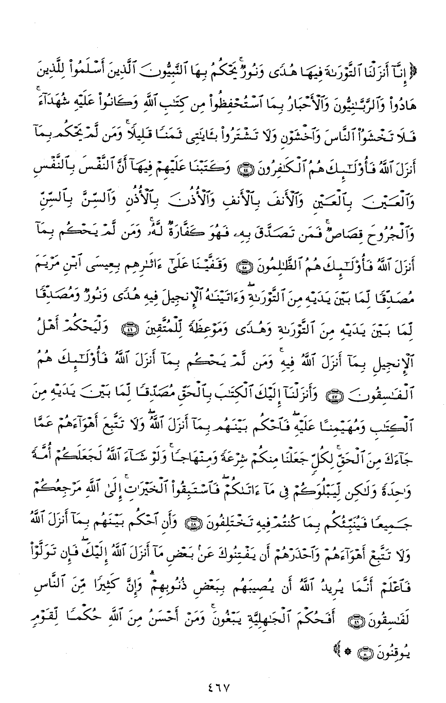 (إِنَّا أَنْزَلْنَا التَّوْرَاةَ فِيهَا هُدًى وَنُورٌ يَحْكُمُ بِهَا النَّبِيُّونَ الَّذِينَ أَسْلَمُوا لِلَّذِينَ هَادُوا وَالرَّبَّانِيُّونَ وَالْأَحْبَارُ بِمَا اسْتُحْفِظُوا مِنْ كِتَابِ اللهِ وَكَانُوا عَلَيْهِ شُهَدَاءَ فَلَا تَخْشَوُا النَّاسَ وَاخْشَوْنِ وَلَا تَشْتَرُوا بِآيَاتِي ثَمَنًا قَلِيلًا وَمَنْ لَمْ يَحْكُمْ بِمَا أَنْزَلَ اللهُ فَأُولَئِكَ هُمُ الْكَافِرُونَ (44) وَكَتَبْنَا عَلَيْهِمْ فِيهَا أَنَّ النَّفْسَ بِالنَّفْسِ وَالْعَيْنَ بِالْعَيْنِ وَالْأَنْفَ بِالْأَنْفِ وَالْأُذُنَ بِالْأُذُنِ وَالسِّنَّ بِالسِّنِّ وَالْجُرُوحَ قِصَاصٌ فَمَنْ تَصَدَّقَ بِهِ فَهُوَ كَفَّارَةٌ لَهُ وَمَنْ لَمْ يَحْكُمْ بِمَا أَنْزَلَ اللهُ فَأُولَئِكَ هُمُ الظَّالِمُونَ (45) وَقَفَّيْنَا عَلَى آثَارِهِمْ بِعِيسَى ابْنِ مَرْيَمَ مُصَدِّقًا لِمَا بَيْنَ يَدَيْهِ مِنَ التَّوْرَاةِ وَآتَيْنَاهُ الْإِنْجِيلَ فِيهِ هُدًى وَنُورٌ وَمُصَدِّقًا لِمَا بَيْنَ يَدَيْهِ مِنَ التَّوْرَاةِ وَهُدًى وَمَوْعِظَةً لِلْمُتَّقِينَ (46) وَلْيَحْكُمْ أَهْلُ الْإِنْجِيلِ بِمَا أَنْزَلَ اللهُ فِيهِ وَمَنْ لَمْ يَحْكُمْ بِمَا أَنْزَلَ اللهُ فَأُولَئِكَ هُمُ الْفَاسِقُونَ (47) وَأَنْزَلْنَا إِلَيْكَ الْكِتَابَ بِالْحَقِّ مُصَدِّقًا لِمَا بَيْنَ يَدَيْهِ مِنَ الْكِتَابِ وَمُهَيْمِنًا عَلَيْهِ فَاحْكُمْ بَيْنَهُمْ بِمَا أَنْزَلَ اللهُ وَلَا تَتَّبِعْ أَهْوَاءَهُمْ عَمَّا جَاءَكَ مِنَ الْحَقِّ لِكُلٍّ جَعَلْنَا مِنْكُمْ شِرْعَةً وَمِنْهَاجًا وَلَوْ شَاءَ اللهُ لَجَعَلَكُمْ أُمَّةً وَاحِدَةً وَلَكِنْ لِيَبْلُوَكُمْ فِي مَا آتَاكُمْ فَاسْتَبِقُوا الْخَيْرَاتِ إِلَى اللهِ مَرْجِعُكُمْ جَمِيعًا فَيُنَبِّئُكُمْ بِمَا كُنْتُمْ فِيهِ تَخْتَلِفُونَ (48) وَأَنِ احْكُمْ بَيْنَهُمْ بِمَا أَنْزَلَ اللهُ وَلَا تَتَّبِعْ أَهْوَاءَهُمْ وَاحْذَرْهُمْ أَنْ يَفْتِنُوكَ عَنْ بَعْضِ مَا أَنْزَلَ اللهُ إِلَيْكَ فَإِنْ تَوَلَّوْا فَاعْلَمْ أَنَّمَا يُرِيدُ اللهُ أَنْ يُصِيبَهُمْ بِبَعْضِ ذُنُوبِهِمْ وَإِنَّ كَثِيرًا مِنَ النَّاسِ لَفَاسِقُونَ (49) أَفَحُكْمَ الْجَاهِلِيَّةِ يَبْغُونَ وَمَنْ أَحْسَنُ مِنَ اللهِ حُكْمًا لِقَوْمٍ يُوقِنُونَ (50)
