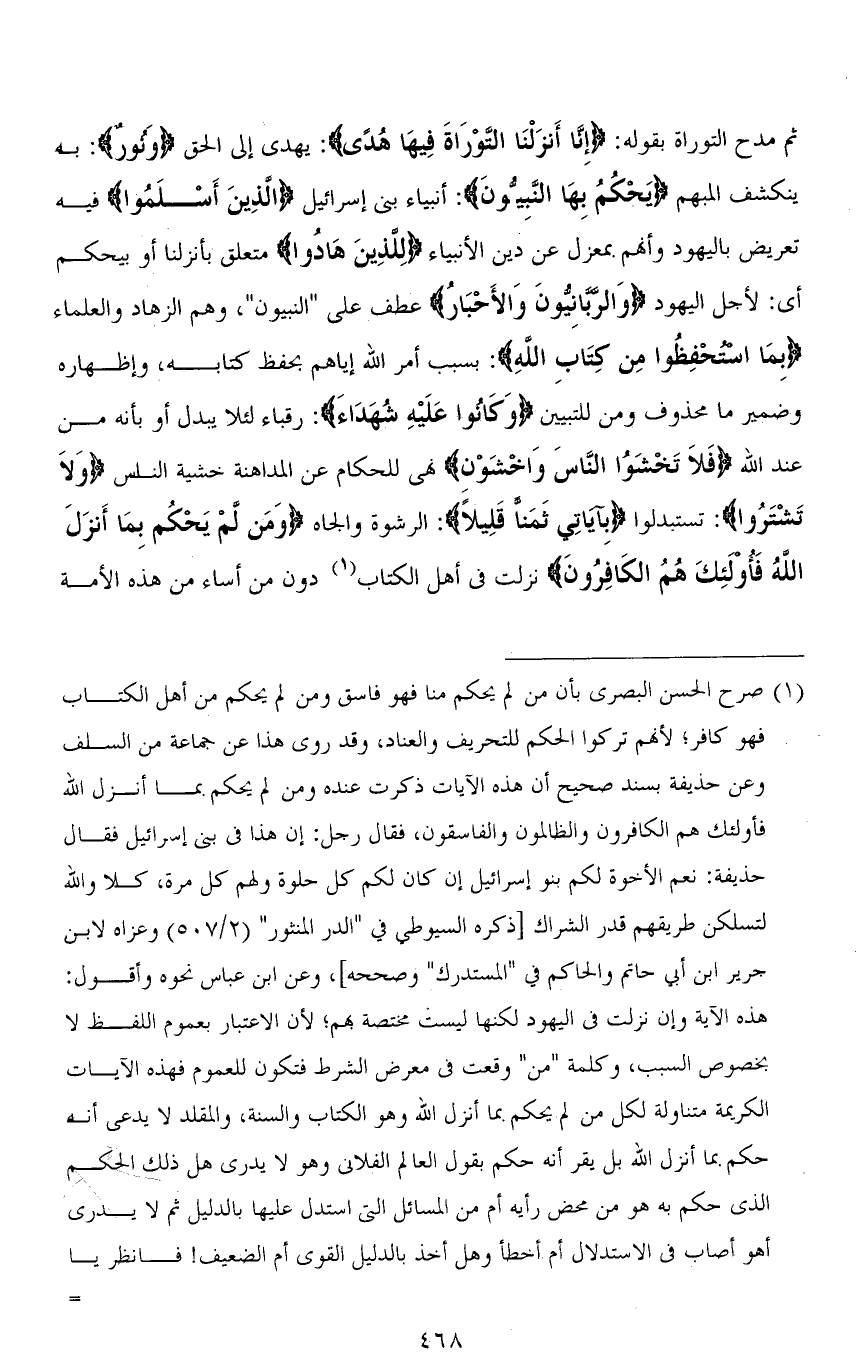 ثم مدح التوراة بقوله: (إِنَّا أَنْزَلْنَا التَّوْرَاةَ فِيهَا هُدًى): يهدى إلى الحق (وَنُورٌ): به ينكشف المبهم (يَحْكُمُ بِهَا النَّبِيُّونَ): أنبياء بني إسرائيل (الَّذِينَ أَسْلَمُوا) فيه تعريض باليهود وأنهم بمعزل عن دين الأنبياء (لِلذِينَ هادُوا) متعلق بـ أنزلنا أو بـ يحكم أى: لأجل اليهود (وَالرَّبَّانِيُّونَ وَالْأَحْبَارُ) عطف على " النبيون "، وهم الزهاد والعلماء (بِمَا استحْفِظُوا مِن كَتابِ اللهِ): بسبب أمر الله إياهم بحفظ كتابه، وإظهاره وضمير ما محذوف ومن للتبيين (وَكَانوا عَلَيْهِ شُهَدَاءَ): رقباء لئلا يبدل أو بأنه من عند الله (فَلاَ تَخشَوُا النَّاسَ وَاخشَوْن) نهي للحكام عن المداهنة خشية الناس (وَلاَ تَشْتَرُوا): تستبدلوا (بِآيَاتِي ثَمَناً قَلِيلاً): الرشوة والجاه (وَمَنْ لَمْ يَحْكُمْ بِمَا أَنْزَلَ اللهُ فَأُولَئِكَ هُمُ الْكَافِرُونَ) نزلت في أهل الكتاب دون من أساء من هذه الأمة