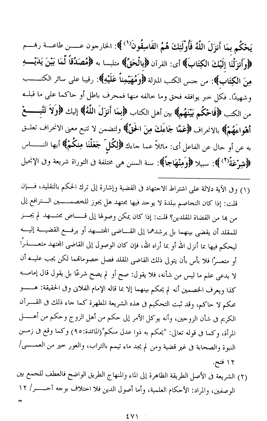 يَحْكُمْ بِمَا أَنْزَلَ اللهُ فَأُولَئِكَ هُمُ الْفَاسِقُونَ): الخارجون عن طاعة ربهم (وَأَنزَلْنَا إِلَيْكَ الْكِتَابَ) أي: القرآن (بِالْحَقِّ) متلبسًا به (مصَدّقاً لِّمَا بَيْنَ يَدَيْه مِنَ الكِتَابِ): من جنس الكتب المنزلة (وَمُهَيْمِنًا عَلَيْهِ): رقيبًا على سائر الكتب وشهيدًا. فكل خبر يوافقه فحق وما خالفه منها فمحرف باطل أو حاكمًا على ما قبله من الكتب (فَاحْكُم بَيْنَهُم) بين أهل الكتاب (بمَا أَنزَلَ اللهُ) إليك (وَلاَ تَتَّبِع أهْواءَهُمْ) بالانحراف (عَمَّا جَاءَكَ مِنَ الحَقِّ) وَلتضمن لا تتبع معنى الانحراف تعلق به عن أو حال عن الفاعل أي: مائلاً عما جاءك (لِكل جَعَلْنَا منكُمْ) أيها الناس (شِرْعَةً): سبيلاً (وَمِنْهَاجاً): سنة السنن هي مختلفة في التوراة شريعة وفي الإنجيل