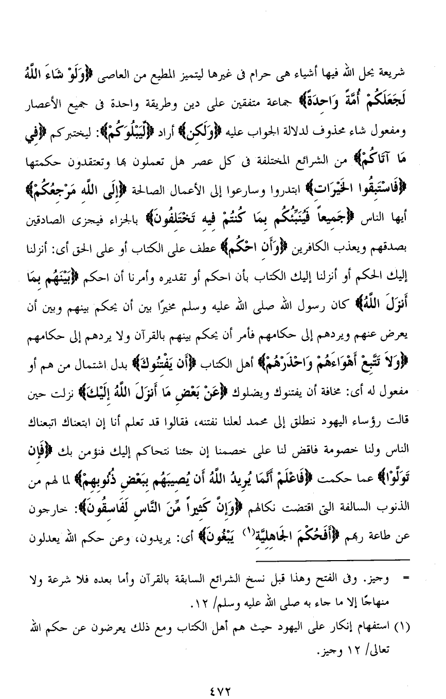 شريعة يحل الله فيها أشياء هي حرام في غيرها ليتميز المطيع من العاصي (وَلَوْ شَاءَ اللهُ لَجَعَلَكُمْ أُمَّةً وَاحِدَةً) جماعة متفقين على دين وطريقة واحدة في جميع الأعصار ومفعول شاء محذوف لدلالة الجواب عليه (وَلَكِنْ) أراد (ليَبْلُوَكُمْ): ليختبركم (فِي مَا آتَاكُمْ) من الشرائع المختلفة في كل عصر هل تعملون بها وتعتقدون حكمتها (فَاسْتَبِقُوا الخيْرَاتِ) ابتدروا وسارعوا إلى الأعمال الصالحة (إِلَى اللهِ مَرْجِعُكُمْ) أيها الناس (جَمِيعاً فَيُنَبِّئُكُم بِمَا كُنتُمْ فِيهِ تَخْتَلِفُونَ) بالجزاء فيجزي الصادقين بصدقهم ويعذب الكافرين (وَأَنِ احْكُم) عطف على الكتاب أو على الحق أي: أنزلنا إليك الحكم أو أنزلنا إليك الكتاب بأن احكم أو تقديره وأمرنا أن احكم (بَيْنَهُم بِمَا أَنزَلَ اللهُ) كان رسول الله صلى الله عليه وسلم مخيَّرًا بين أن يحكم بينهم وبين أن يعرض عنهم ويردهم إلى حكامهم فأمر أن يحكم بينهم بالقرآن ولا يردهم إلى حكامهم (وَلَا تَتَّبِعْ أَهْوَاءَهُمْ وَاحْذَرْهُمْ) أهل الكتاب (أَن يَفْتِنُوكَ) بدل اشتمال من هم أو مفعول له أي: مخافة أن يفتنوك ويضلوك (عَنْ بَعْضِ مَا أَنزَلَ اللهُ إِلَيْكَ) نزلت حين قالت رؤساء اليهود ننطلق إلى محمد لعلنا نفتنه، فقالوا قد تعلم أنا إن اتبعناك [اتبعك] (1) الناس ولنا خصومة فاقض لنا على خصمنا إن جئنا نتحاكم إليك فنؤمن بك (فَإِنْ تَوَلَّوْا) عما حكمت (فَاعْلَمْ أَنَّمَا يُرِيدُ اللهُ أَنْ يُصِيبَهُمْ بِبَعْضِ ذُنُوبِهِمْ) لما لهم من الذنوب السالفة التي اقتضت نكالهم (وَإِنَّ كَثِيرًا مِنَ النَّاسِ لَفَاسِقُونَ): خارجون عن طاعة ربهم (أَفَحُكْمَ الجَاهِلِيَّةِ يَبْغُونَ) أي: يريدون، وعن حكم الله يعدلون