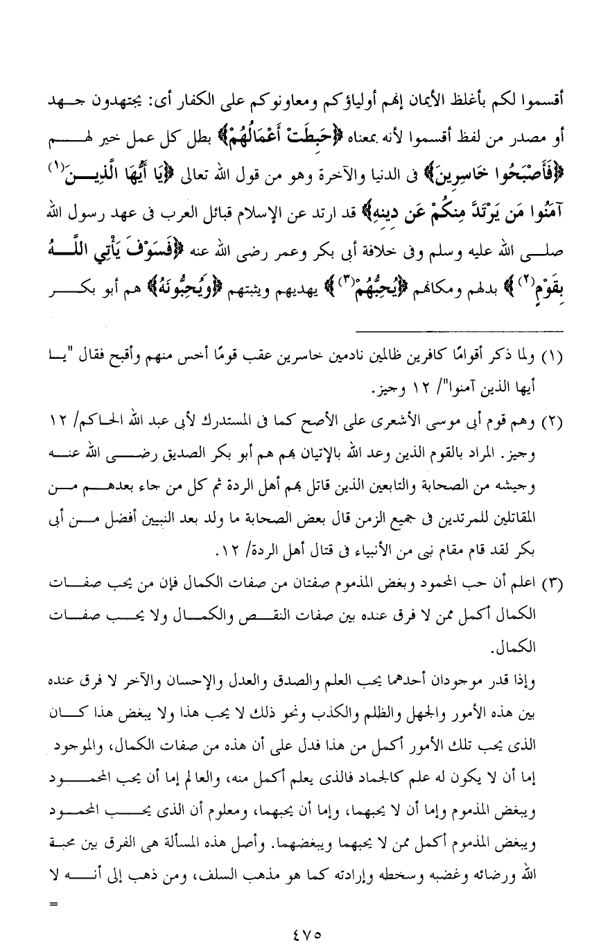 أقسموا لكم بأغلظ الأيمان أنهم أولياؤكم ومعاونوكم على الكفار أي: يجتهدون جهد أو مصدر من لفظ أقسموا لأنه بمعناه (حَبِطَتْ أَعْمَالُهُمْ) بطل كل عمل خير لهم (فَأَصْبَحُوا خَاسِرِينَ) في الدنيا والآخرة وهو من قول الله تعالى (يَا أَيُّهَا الَّذِينَ آمَنوا مَنْ يَرْتَدَّ مِنْكُمْ عَنْ دِينِهِ) قد ارتد عن الإسلام قبائل العرب في عهد رسول الله صلى الله عليه وسلم وفي خلافة أبى بكر وعمر رضى الله عنه (فَسَوْفَ يَأْتِي اللهُ بِقَوْمٍ) بدلهم ومكانهم (يُحِبُّهُمْ) يهديهم ويثبتهم (وَيُحِبُّونَهُ) هم أبو بكر