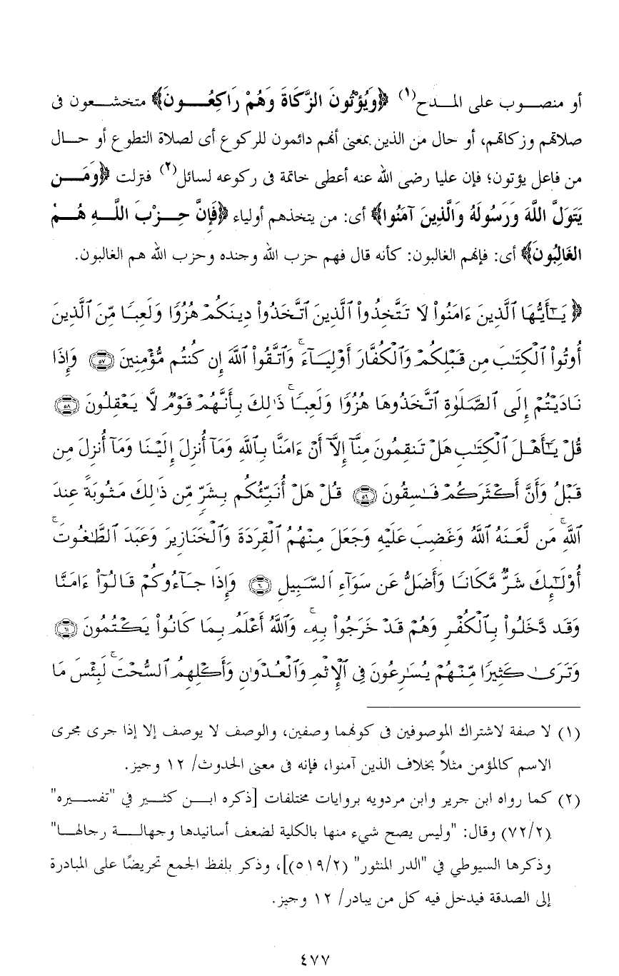 (يَا أَيُّهَا الَّذِينَ آمَنُوا لَا تَتَّخِذُوا الَّذِينَ اتَّخَذُوا دِينَكُمْ هُزُوًا وَلَعِبًا مِنَ الَّذِينَ أُوتُوا الْكِتَابَ مِنْ قَبْلِكُمْ وَالْكُفَّارَ أَوْلِيَاءَ وَاتَّقُوا اللهَ إِنْ كُنْتُمْ مُؤْمِنِينَ (57) وَإِذَا نَادَيْتُمْ إِلَى الصَّلَاةِ اتَّخَذُوهَا هُزُوًا وَلَعِبًا ذَلِكَ بِأَنَّهُمْ قَوْمٌ لَا يَعْقِلُونَ (58) قُلْ يَا أَهْلَ الْكِتَابِ هَلْ تَنْقِمُونَ مِنَّا إِلَّا أَنْ آمَنَّا بِاللهِ وَمَا أُنْزِلَ إِلَيْنَا وَمَا أُنْزِلَ مِنْ قَبْلُ وَأَنَّ أَكْثَرَكُمْ فَاسِقُونَ (59) قُلْ هَلْ أُنَبِّئُكُمْ بِشَرٍّ مِنْ ذَلِكَ مَثُوبَةً عِنْدَ اللهِ مَنْ لَعَنَهُ اللهُ وَغَضِبَ عَلَيْهِ وَجَعَلَ مِنْهُمُ الْقِرَدَةَ وَالْخَنَازِيرَ وَعَبَدَ الطَّاغُوتَ أُولَئِكَ شَرٌّ مَكَانًا وَأَضَلُّ عَنْ سَوَاءِ السَّبِيلِ (60) وَإِذَا جَاءُوكُمْ قَالُوا آمَنَّا وَقَدْ دَخَلُوا بِالْكُفْرِ وَهُمْ قَدْ خَرَجُوا بِهِ وَاللهُ أَعْلَمُ بِمَا كَانُوا يَكْتُمُونَ (61) وَتَرَى كَثِيرًا مِنْهُمْ يُسَارِعُونَ فِي الْإِثْمِ وَالْعُدْوَانِ وَأَكْلِهِمُ السُّحْتَ لَبِئْسَ مَا