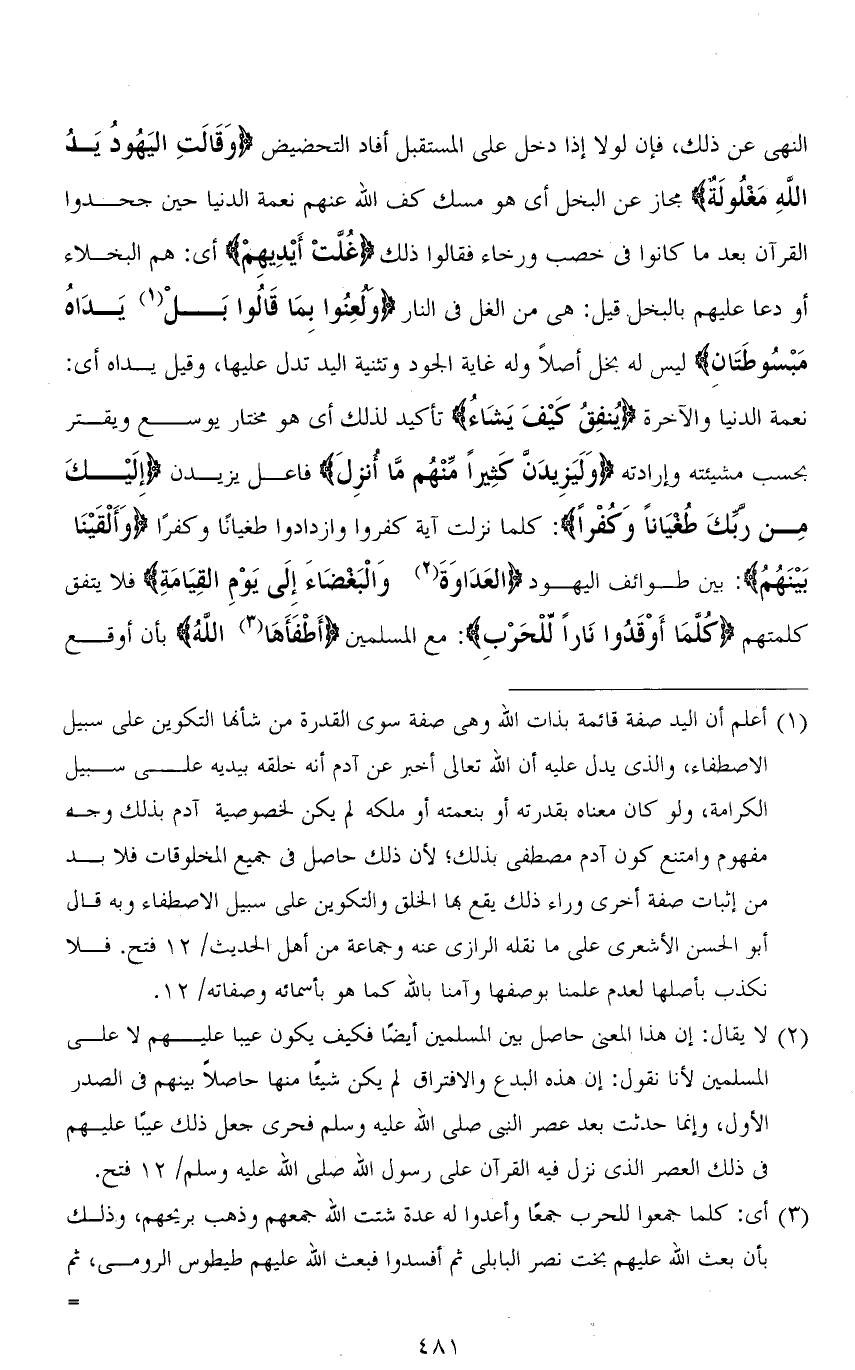 النهي عن ذلك، فإن لولا إذا دخل على المستقبل أفاد التحضيض (وَقَالَتِ اليَهُودُ يَدُ اللهِ مَغْلُولَة) مجاز عن البخل أي هو مسك كف الله عنهم نعمة الدنيا حين جحدوا القرآن بعد ما كانوا في خصب ورخاء فقالوا ذلك (غُلَّتْ أَيْدِيهِمْ) أي: هم البخلاء أو دعا عليهم بالبخل. قيل: هي من الغل في النار (وَلُعِنُوا بِمَا قَالُوا بَلْ يَدَاهُ مَبْسُوطَتَانِ) ليس له بخل أصلاً وله غاية الجود وتثنية اليد تدل عليها، وقيل يداه أي: نعمة الدنيا والآخرة (يُنفقُ كيْفَ يَشَاءُ) تأكيد لذلك أي هو مختار يوسع ويقتر بحسب مشيئته وإرادته (وَلَيَزِيدَنَّ كَثِيرًا مِنْهُمْ مَا أُنْزِلَ) فاعل يزيدن (إِلَيْكَ مِنْ رَبِّكَ طُغْيَانًا وَكُفْرًا): كلما نزلت آية كفروا وازدادوا طغيانًا وكفرًا (وَأَلْقَيْنَا بَيْنَهُمُ): بين طوائف اليهود (الْعَدَاوَةَ وَالْبَغْضَاءَ إِلَى يَوْمِ الْقِيَامَةِ) فلا يتفق