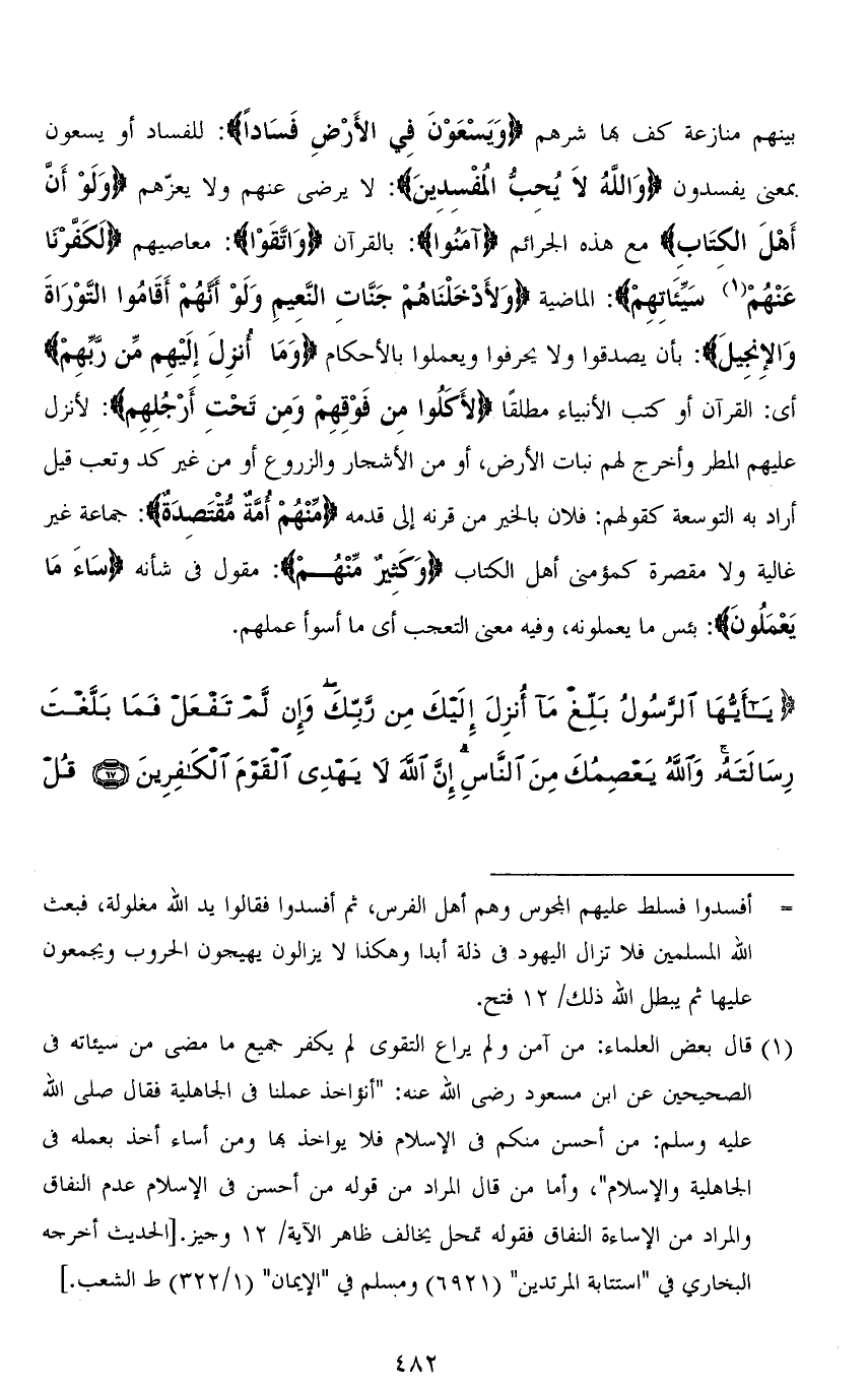 بينهم منازعة كف بها شرهم (وَيَسْعَوْنَ فِي الْأَرْضِ فَسَادًا): للفساد أو يسعون بمعنى يفسدون (وَاللهُ لَا يُحِبُّ الْمُفْسِدِينَ): لا يرضى عنهم ولا يعزّهم (وَلَوْ أَنَّ أَهْلَ الْكِتَابِ) مع هذه الجرائم (آمَنُوا): بالقرآن (وَاتَّقَوْا): معاصيهم (لَكَفرْنَا عَنْهُمْ َ سَيًّئَاتِهِمْ): الماضية (وَلأَدْخَلْنَاهُمْ جَنَّاتِ النَّعِيمِ وَلَوْ أَنَّهُمْ أَقَامُوا التَّوْرَاةَ وَالْإِنْجِيلَ): بأن يصدقوا ولا يحرفوا ويعملوا بالأحكام (وَمَا أنزِلَ إِلَيْهِم مِّن ربهِمْ) أى: القرآن أو كتب الأنبياء مطلقًا (لأَكَلُوا مِن فَوْقِهِمْ وَمِن تَحْتِ أَرْجُلِهِم): لأنزل عليهم المطر وأخرج لهم نبات الأرض، أو من الأشجار والزروع أو من غير كَدٍّ وتعب قيل أراد به التوسعة كقولهم: فلان بالخير من قرنه إلى قدمه (مِنْهُمْ أُمَّةٌ مُقْتَصِدَةٌ): جماعة غير غالية ولا مقصرة كمؤمني أهل الْكِتَاب (وَكَثِيرٌ مِنْهُمْ): مقول في شأنه (سَاءَ مَا يَعْمَلُون): بئس ما يعملونه، وفيه معنى التعجب أي ما أسوأ عملهم.