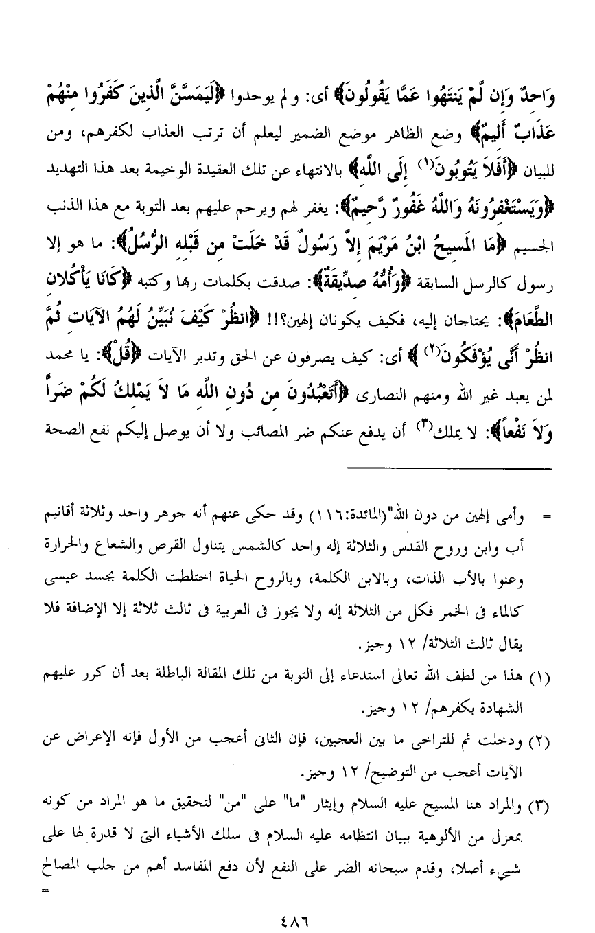 وَإِن لَمْ يَنتَهُوا عَمَّا يَقُولُونَ) أي: ولم يوحدوا (لَيَمَسَّنَّ الَّذِينَ كَفَرُوا مِنْهُمْ عَذَابٌ أَلِيمٌ) وضع الظاهر موضع الضمير ليعلم أن ترتب العذاب لكفرهم، ومن للبيان (أَفَلَا يَتُوبُونَ إِلَى اللهِ) بالانتهاء عن تلك العقيدة الوخيمة بعد هذا التهديد (وَيَسْتَغْفِرُونَهُ وَاللهُ غَفُورٌ رَحِيمٌ): يغفر لهم ويرحم عليهم بعد التوبة مع هذا الذنب الجسيم (مَا الْمَسِيحُ ابْنُ مَرْيَمَ إِلَّا رَسُولٌ قَدْ خَلَتْ مِنْ قَبْلِهِ الرُّسُلُ): ما هو إلا رسول كالرسل السابقة (وَأُمُّهُ صِدِّيقَةٌ): صدقت بكلمات ربها وكتبه (كَانَا يَأْكُلَانِ الطَّعَامَ): يحتاجان إليه، فكيف يكونان إلهين؟!! (انْظُرْ كَيْفَ نُبَيِّنُ لَهُمُ الْآيَاتِ ثُمَّ انْظُرْ أَنَّى يُؤْفَكُونَ) أي: كيف يصرفون عن الحق وتدبر الآيات (قُلْ): يا محمد لمن يعبد غير الله ومنهم النصارى (أَتَعْبُدُونَ مِنْ دُونِ اللهِ مَا لَا يَمْلِكُ لَكُمْ ضَرًّا وَلَا نَفْعًا): لا يملك أن يدفع عنكم ضر المصائب ولا أن يوصل إليكم نفع الصحة