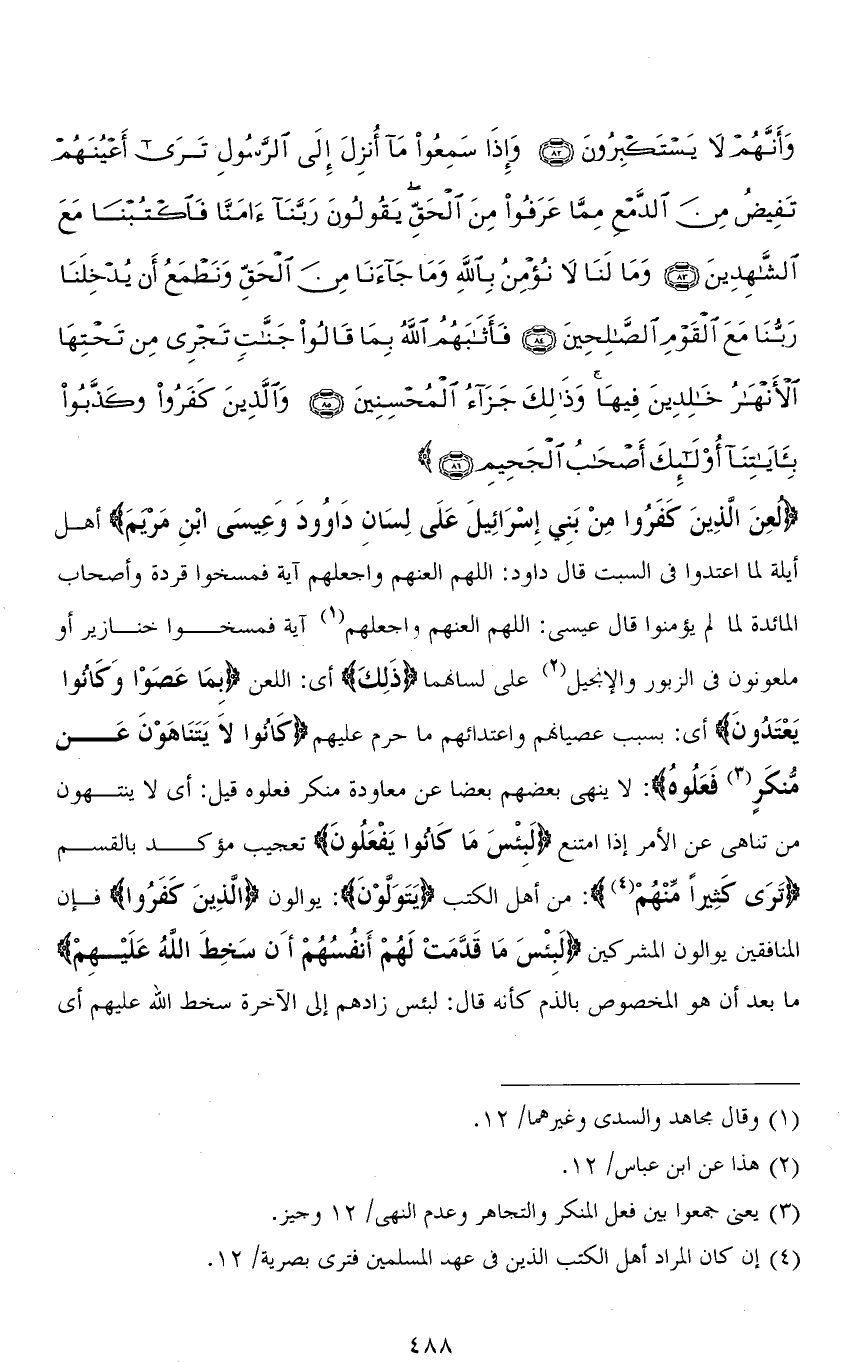 وَأَنَّهُمْ لَا يَسْتَكْبِرُونَ (82) وَإِذَا سَمِعُوا مَا أُنْزِلَ إِلَى الرَّسُولِ تَرَى أَعْيُنَهُمْ تَفِيضُ مِنَ الدَّمْعِ مِمَّا عَرَفُوا مِنَ الْحَقِّ يَقُولُونَ رَبَّنَا آمَنَّا فَاكْتُبْنَا مَعَ الشَّاهِدِينَ (83) وَمَا لَنَا لَا نُؤْمِنُ بِاللهِ وَمَا جَاءَنَا مِنَ الْحَقِّ وَنَطْمَعُ أَنْ يُدْخِلَنَا رَبُّنَا مَعَ الْقَوْمِ الصَّالِحِينَ (84) فَأَثَابَهُمُ اللهُ بِمَا قَالُوا جَنَّاتٍ تَجْرِي مِنْ تَحْتِهَا الْأَنْهَارُ خَالِدِينَ فِيهَا وَذَلِكَ جَزَاءُ الْمُحْسِنِينَ (85) وَالَّذِينَ كَفَرُوا وَكَذَّبُوا بِآيَاتِنَا أُولَئِكَ أَصْحَابُ الْجَحِيمِ (86)
