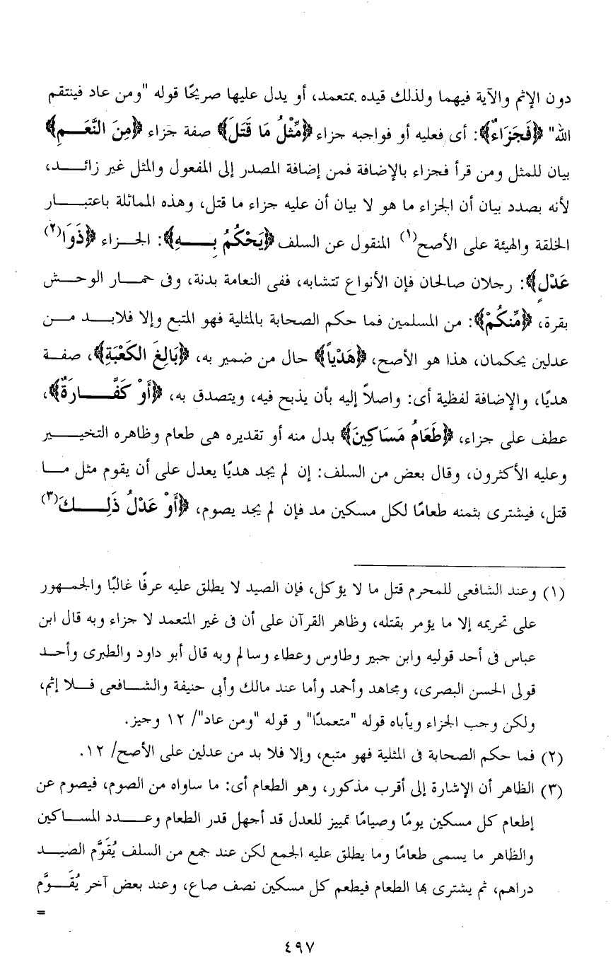 دون الإثم والآية فيهما ولذلك قيده بمتعمد، أو يدل عليها صريحًا قوله " ومن عاد فينتقم الله " (فجَزَاءٌ): أي فعليه أو فواجبه جزاء (مِثْلُ مَا قَتَلَ) صفة جزاء (مِنَ النَّعَمِ) بيان للمثل ومن قرأ (فجزاءُ) بالإضافة فمن إضافة المصدر إلى المفعول والمثل غير زائد، لأنه بصدد بيان أن الجزاء ما هو لا بيان أن عليه جزاء ما قتل، وهذه المماثلة باعتبار الخلقة والهيئة على الأصح المنقول عن السلف (يَحْكُمُ بِهِ): الجزاء (ذَوَا عَدْلٍ): رجلان صالحان فإن الأنواع تتشابه، ففي النعامة بدنة، وفي حمار الوحش بقرة، (مِّنكُمْ): من المسلمين فما حكم الصحابة بالمثلية فهو المتبع وإلا فلا بد من عدلين يحكمان، هذا هو الأصح، (هَدْياً) حال من ضمير به، (بَالِغَ الكَعْبَةِ)، صفة هديًا، والإضافة لفظية أي: واصلاً إليه بأن يذبح فيه، ويتصدق به، (أَوْ كَفارَةٌ)، عطف على جزاء، (طَعَامُ مَسَاكِينَ) بدل منه أو تقديره هي طعام وظاهره التخيير وعليه الأكثرون، وقال بعض من السلف: إن لم يجد هديًا يعدل على أن يقوم مثل ما قتل، فيشترى بثمنه طعامًا لكل مسكين مدّ فإن لم يجد يصوم، (أَوْ عَدْلُ ذَلِكَ