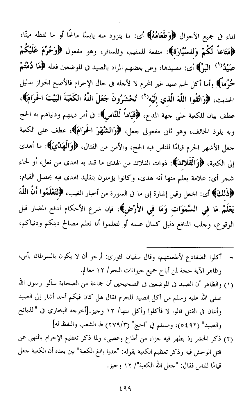 الماء في جميع الأحوال (وَطَعَامُهُ) أي: ما يتزود منه يابسًا مالحًا أو ما لفظه ميتًا، (مَتَاعًا لَكُمْ وَلِلسَّيَّارَةِ): منفعة للمقيم، والمسافر، وهو مفعول (وَحُرِّمَ عَلَيْكُمْ صَيْدُ الْبَرِّ) أي: مصيدها، وعن بعضهم المراد بالصيد في الموضعين فعله (مَا دُمْتُمْ حُرُمًا) وأما أكل لحم صيد غير المحرم لا لأجله في حال الإحرام فالأصح الجواز بدليل الحديث، (وَاتَّقُوا اللهَ الَّذِي إِلَيْهِ تُحْشَرُونَ جَعَلَ اللهُ الكَعْبَةَ البَيْتَ الحَرَامَ)، عطف بيان للكعبة على جهة المدح، (قِيَامًا لِلنَّاسِ): في أمر دينهم ودنياهم به الحج وبه يلوذ الخائف، وهو ثاني مفعولي جعل، (وَالشَّهْرَ الحَرَامَ)، عطف على الكعبة جعل الأشهر الحرم قيامًا للناس فيه الحج، والأمن من القتال، (وَالْهَدْيَ): ما أهدى إلى الكعبة، (وَالْقَلَائِدَ): ذوات الْقَلَائِدَ من الهدي ما قلد به الهدي من نعل، أو لحاء شجر أي: علامة يعلم منها أنه هدي، وكانوا يؤمنون بتقليد الهدي فبه يحصل القيام، (ذلِكَ) أي: الجعل وقيل إشارة إلى ما في السورة من أخبار الغيب، (لِتَعْلَمُوا أَنَّ اللهَ يَعْلَمُ مَا فِي السَّمَاوَاتِ وَمَا فِي الْأَرْضِ)، فإن شرع الأحكام لدفع المضار قبل الوقوع، وجلب المنافع دليل كمال علمه أو لتعلموا أنا نعلم مصالح دينكم ودنياكم،
