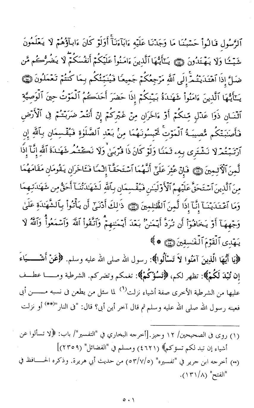 الرَّسُولِ قَالُوا حَسْبُنَا مَا وَجَدْنَا عَلَيْهِ آبَاءَنَا أَوَلَوْ كَانَ آبَاؤُهُمْ لَا يَعْلَمُونَ شَيْئًا وَلَا يَهْتَدُونَ (104) يَا أَيُّهَا الَّذِينَ آمَنُوا عَلَيْكُمْ أَنْفُسَكُمْ لَا يَضُرُّكُمْ مَنْ ضَلَّ إِذَا اهْتَدَيْتُمْ إِلَى اللهِ مَرْجِعُكُمْ جَمِيعًا فَيُنَبِّئُكُمْ بِمَا كُنْتُمْ تَعْمَلُونَ (105) يَا أَيُّهَا الَّذِينَ آمَنُوا شَهَادَةُ بَيْنِكُمْ إِذَا حَضَرَ أَحَدَكُمُ الْمَوْتُ حِينَ الْوَصِيَّةِ اثْنَانِ ذَوَا عَدْلٍ مِنْكُمْ أَوْ آخَرَانِ مِنْ غَيْرِكُمْ إِنْ أَنْتُمْ ضَرَبْتُمْ فِي الْأَرْضِ فَأَصَابَتْكُمْ مُصِيبَةُ الْمَوْتِ تَحْبِسُونَهُمَا مِنْ بَعْدِ الصَّلَاةِ فَيُقْسِمَانِ بِاللهِ إِنِ ارْتَبْتُمْ لَا نَشْتَرِي بِهِ ثَمَنًا وَلَوْ كَانَ ذَا قُرْبَى وَلَا نَكْتُمُ شَهَادَةَ اللهِ إِنَّا إِذًا لَمِنَ الْآثِمِينَ (106) فَإِنْ عُثِرَ عَلَى أَنَّهُمَا اسْتَحَقَّا إِثْمًا فَآخَرَانِ يَقُومَانِ مَقَامَهُمَا مِنَ الَّذِينَ اسْتَحَقَّ عَلَيْهِمُ الْأَوْلَيَانِ فَيُقْسِمَانِ بِاللهِ لَشَهَادَتُنَا أَحَقُّ مِنْ شَهَادَتِهِمَا وَمَا اعْتَدَيْنَا إِنَّا إِذًا لَمِنَ الظَّالِمِينَ (107) ذَلِكَ أَدْنَى أَنْ يَأْتُوا بِالشَّهَادَةِ عَلَى وَجْهِهَا أَوْ يَخَافُوا أَنْ تُرَدَّ أَيْمَانٌ بَعْدَ أَيْمَانِهِمْ وَاتَّقُوا اللهَ وَاسْمَعُوا وَاللهُ لَا يَهْدِي الْقَوْمَ الْفَاسِقِينَ (108)