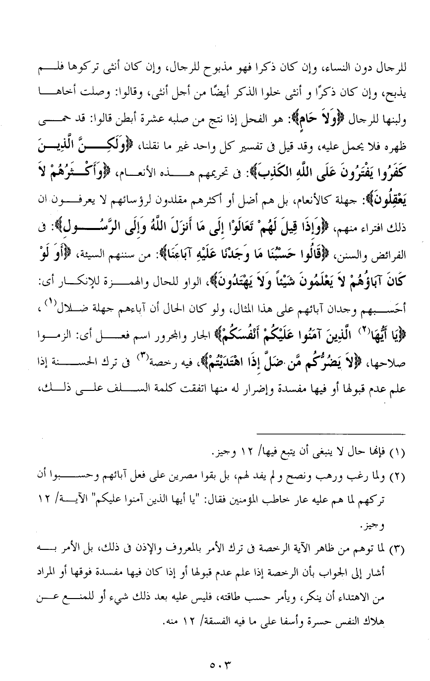 للرجال دون النساء، وإن كان ذكرًا فهو مذبوح للرجال، وإن كان أنثى تركوها فلم يذبح، وإن كان ذكرًا وأنثى خلوا الذكر أيضًا من أجل أنثى، وقالوا: وصلت أخاها ولبنها للرجال (وَلاَ حَامٍ): هو الفحل إذا نتج من صلبه عشرة أبطن قالوا: قد حمى ظهره فلا يحمل عليه، وقد قيل في تفسير كل واحد غير ما نقلنا، (وَلَكِنَّ الّذِينَ كَفَرُوا يَفْتَرُونَ عَلَى اللهِ الكَذِبَ): في تحريمهم هذه الأنعام، (وَأَكْثَرُهُمْ لاَ يَعْقِلُون): جهلة كالأنعام، بل هم أضل أو أكثرهم مقلدون لرؤسائهم لا يعرفون أن ذلك افتراء منهم، (وَإِذَا قِيلَ لَهُمْ تَعَالَوْا إِلَى مَا أَنْزَلَ اللهُ وَإِلَى الرَّسُولِ): في الفرائض والسنن، (قَالُوا حَسْبُنَا مَا وَجَدْنَا عَلَيْهِ آباءَنَا): من سننهم السيئة، (أَوَلَوْ كَانَ آبَاؤُهُمْ لَا يَعْلَمُونَ شَيْئًا وَلَا يَهْتَدُونَ)، الواو للحال والهمزة للإنكار أي: أحَسبهم وجدان آبائهم على هذا المثال، ولو كان الحال أن آباءهم جهلة ضلال، (يَا أَيُّهَا الَّذِينَ آمَنُوا عَلَيْكُمْ أَنْفُسَكُمْ) الجار والمجرور اسم فعل أي: الزموا صلاحها، (لَا يَضُرُّكُمْ مَنْ ضَلَّ إِذَا اهْتَدَيْتُمْ)، فيه رخصة في ترك الحسنة إذا علم عدم قبولها أو فيها مفسدة وإضرار له منها اتفقت كلمة السلف على ذلك،