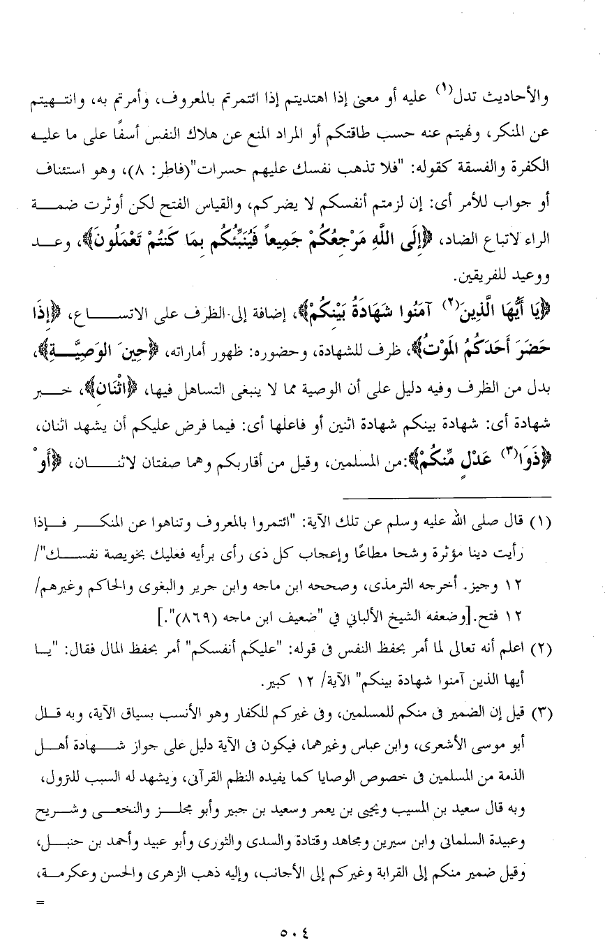 (يَا أَيُّهَا الَّذِينَ آمَنُوا شَهَادَةُ بَيْنِكُمْ)، إضافة إلى الظرف على الاتساع، (إِذَا حَضَرَ أَحَدَكُمُ الْمَوْتُ)، ظرف للشهادة، وحضوره: ظهور أماراته، (حِينَ الوَصِيَّةِ)، بدل من الظرف وفيه دليل على أن الوصية مما لا ينبغي التساهل فيها، (اثْنَانِ)، خبر شهادة أي: شهادة بينكم شهادة اثنين أو فاعلها أي: فيما فرض عليكم أن يشهد اثنان، (ذَوَا عَدْلٍ مِنْكُمْ): من المسلمين، وقيل من أقاربكم وهما صفتان لاثنان، (أَوْ