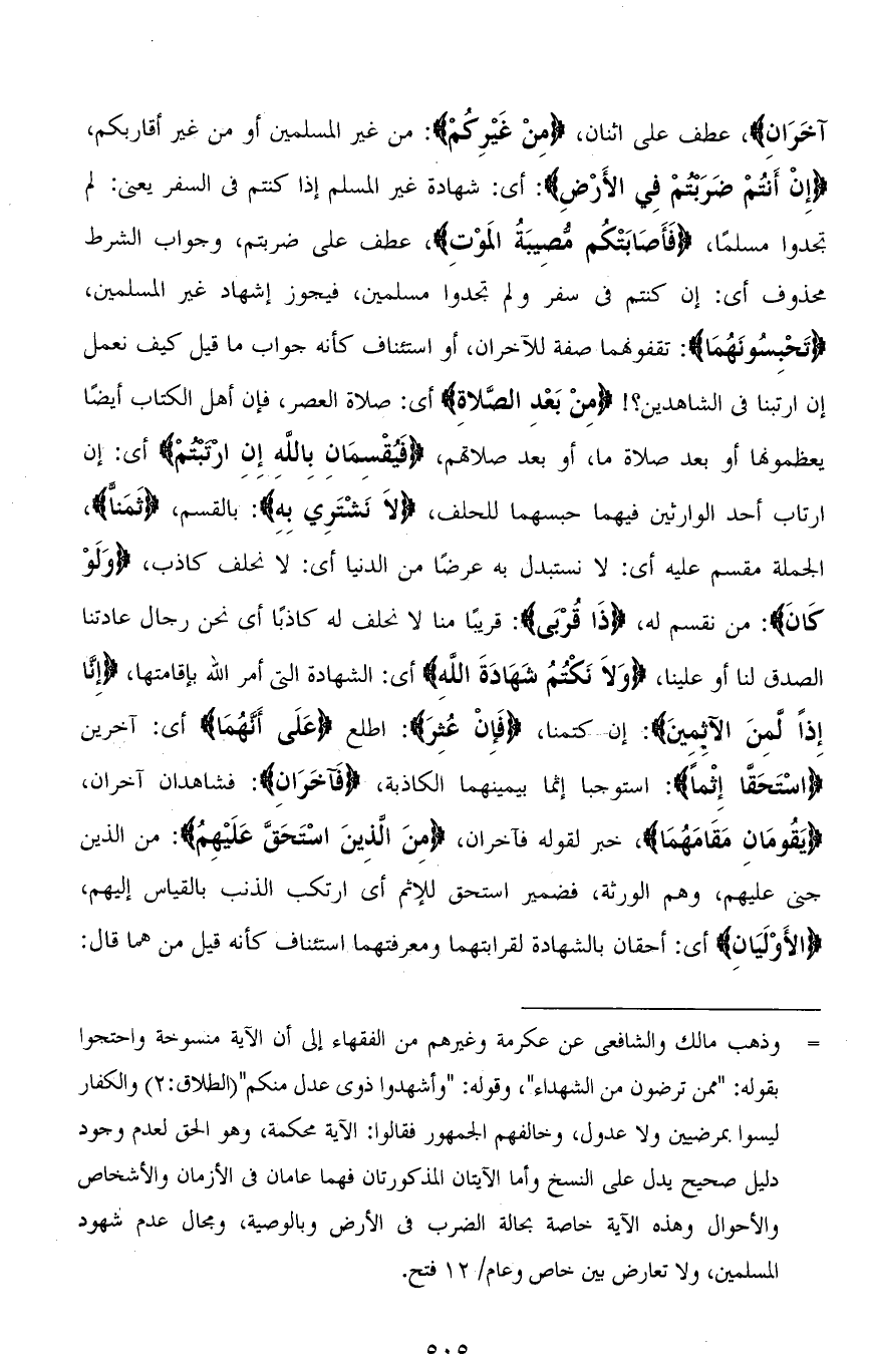 آخَرَانِ)، عطف على اثنان، (مِنْ غَيْرِكُمْ): من غير المسلمين أو من غير أقاربكم، (إِنْ أَنْتُمْ ضَرَبْتُمْ فِي الْأَرْضِ): أي: شهادة غير المسلم إذا كنتم في السفر يعني: لم تجدوا مسلمًا، (فَأَصَابَتْكُمْ مُصِيبَةُ الْمَوْتِ)، عطف على ضربتم، وجواب الشرط محذوف أي: إن كنتم في سفر ولم تجدوا مسلمين، فيجوز إشهاد غير المسلمين، (تَحْبِسُونَهُمَا): تقفونهما صفة للآخران، أو استئناف كأنه جواب ما قيل كيف نعمل إن ارتبنا في الشاهدين؟! (مِنْ بَعْدِ الصَّلاةِ) أي: صلاة العصر، فإن أهل الكتاب أيضًا يعظمونها أو بعد صلاة ما، أو بعد صلاتهم، (فَيُقْسِمَانِ بِاللهِ إِنِ ارْتَبْتُمْ) أي: إن ارتاب أحد الوارثين فيهما حبسهما للحلف، (لَا نَشْتَرِي بِهِ) بالقسم، (ثَمَنًا)، الجملة مقسم عليه أي: لا نستبدل به عرضًا من الدنيا أي: لا نحلف كاذباً، (وَلَوْ كَان): من نقسم له، (ذا قُرْبَى): قريبًا منا لا نحلف له كاذبًا أي نحن رجال عادتنا الصدق لنا أو علينا، (وَلَا نَكْتُمُ شَهَادَةَ اللهِ) أي: الشهادة التي أمر الله بإقامتها، (إِنَّا إِذًا لَمِنَ الْآثِمِينَ): إن كتمنا، (فَإِنْ عُثِرَ): اطلع (عَلَى أَنَّهُمَا) أي: آخرين (اسْتَحَقَّا إِثْمًا): استوجبا إثمًا بيمينهما الكاذبة، (فَآخَرَانِ): فشاهدان آخران، (يَقُومَانِ مَقَامَهُمَا)، خبر لقوله (فَآخَرَانِ)، (مِنَ الذِينَ اسْتَحَقَّ عَلَيْهِمُ): من الذين جنى عليهم، وهم الورثة، فضمير استحق للإثم أي ارتكب الذنب بالقياس إليهم، (الْأَوْلَيَانِ) أي: أحقان بالشهادة لقرابتهما ومعرفتهما استئناف كأنه قيل من هما قال: