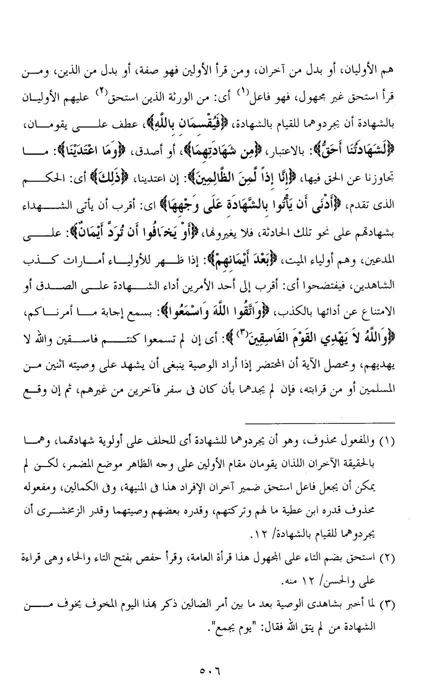 هم الأوليان، أو بدل من آخران، ومن قرأ الأولين فهو صفة، أو بدل من الذين، ومن قرأ اسْتَحَقَّ غير مجهول، فهو فاعل أي: من الورثة الذين استحق عليهم الأوليان بالشهادة أن يجردوهما للقيام بالشهادة، (فَيُقْسِمَانِ بِاللهِ)، عطف على يقومان، (لَشَهَادَتُنَا أَحَقُّ): بالاعتبار، (مِن شَهَادَتِهِمَا)، أو أصدق، (وَمَا اعْتَدَيْنَا): ما تجاوزنا عن الحق فيها، (إِنَّا إِذًا لَمِنَ الظَّالِمِينَ): إن اعتدينا، (ذَلِكَ) أي: الحكم الذي تقدم، (أَدْنَى أَنْ يَأْتُوا بِالشَّهَادَةِ عَلَى وَجْهِهَا) أي: أقرب أن يأتى الشهداء بشهادتهم على نحو تلك الحادثة، فلا يغيرونها، (أَوْ يَخَافُوا أَنْ تُرَدَّ أَيْمَانٌ): على المدعين، وهم أولياء الميت، (بَعْدَ أَيْمَانِهِمْ): إذا ظهر للأولياء أمارات كذب الشاهدين، فيفتضحوا أي: أقرب إلى أحد الأمرين أداء الشهادة على الصدق أو الامتناع عن أدائها بالكذب، (وَاتَّقُوا اللهَ وَاسْمَعُوا): بسمع إجابة ما أمرناكم، (وَاللهُ لَا يَهْدِي الْقَوْمَ الْفَاسِقِينَ): أي إن لم تسمعوا كنتم فاسقين والله لا يهديهم، ومحصل الآية أن المحتضر إذا أراد الوصية ينبغي أن يشهد على وصيته اثنين من المسلمين أو من قرابته، فإن لم يجدهما بأن كان في سفر فآخرين من غيرهم، ثم إن وقع