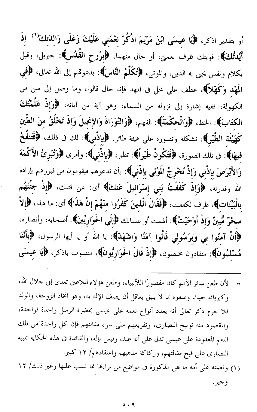أو بتقدير اذكر، (يَا عِيسَى ابْنَ مَرْيَمَ اذْكُرْ نِعْمَتِي عَلَيْكَ وَعَلَى وَالِدَتِكَ إِذْ أَيَّدْتُكَ): قويتك ظرف نعمتي، أو حال منهما، (بِرُوحِ الْقُدُسِ): جبريل، وقيل بكلام ونفس يحيى به الدين، والموتى، (تُكَلِّمُ النَّاسَ): بدعوتهم إلى الله تعالى، (فِي الْمَهْدِ وَكَهْلًا)، عطف على محل في المهد فإنه حال قالوا، وما وصل إلى سن من الكهولة، ففيه إشارة إلى نزوله من السماء، وهو آية من آياته، (وَإِذْ عَلَّمْتُكَ الْكِتَابَ): الخط، (وَالْحِكْمَةَ): الفهم، (وَالتَّوْرَاةَ وَالإِنجيلَ وَإِذْ تَخْلُقُ مِنَ الطِّينِ كَهَيْئَةِ الطَّيْرِ): تشكله وتصوره على هيئة طائر، (بِإِذْنِي): لك في ذلك، (فَتَنْفُخُ فِيهَا): في تلك الصورة، (فَتَكُونُ طَيْرًا): تطير، (بِإِذْنِي): وأمري (وَتُبْرِئُ الْأَكْمَهَ وَالْأَبْرَصَ بِإِذْنِي وَإِذْ تُخْرِجُ الْمَوْتَى بِإِذْنِي): بأن تدعوهم فيقومون من قبورهم بإرادة الله وقدرته، (وَإِذْ كَفَفْتُ بَنِي إِسْرَائِيلَ عَنكَ) أي: عن قتلك (إِذْ جئْتَهُم بِالْبَيِّنَاتِ)، ظرف لكففت، (فَقَالَ الَّذِينَ كَفَرُوا مِنْهُمْ إِنْ هذَا) أي: ما هذا، َ (إِلَّا سِحْرٌ مُبِينٌ وَإِذْ أَوْحَيْتُ): ألهمت أو بلسانك (إِلَى الحَوَارِيِّينَ): أصحابه، وأنصاره، (أَنْ آمِنُوا بِي وَبِرَسُولِي قَالُوا آمَنَّا وَاشْهَدْ): يا الله أو يا أيها الرسول، (بِأَنَّنَا مُسْلِمُونَ): منقادون مخلصون، (إِذْ قَالَ الْحَوَارِيُّونَ)، منصوب باذكر، (يَا عِيسَى