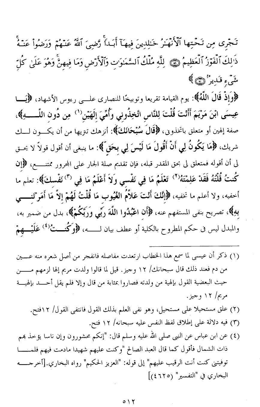 ((وَإِذْ قَالَ اللهُ): يوم القيامة تقريعًا وتوبيخًا للنصارى على رءوس الأشهاد، (يَا عِيسَى ابْنَ مَرْيَمَ أَأَنْتَ قُلْتَ لِلنَّاسِ اتَّخِذُونِي وَأُمِّيَ إِلَهَيْنِ مِنْ دُونِ اللهِ)، صفة إلهين أو متعلق بـ اتخذوني، (قَالَ سُبْحَانَكَ): أنزهك تنزيهًا من أن يكون لك شريك، (مَا يَكُونُ لِي أَنْ أَقُولَ مَا لَيْسَ لِي بِحَقٍّ): ما ينبغي أن أقول قولاً لا يحق فى أن أقوله فمتعلق لي بحق المقدر قبله، فإن تقدم صلة الجار على المجرور ممتنع، (إِنْ كُنْتُ قُلْتُهُ فَقَدْ عَلِمْتَهُ تَعْلَمُ مَا فِي نَفْسِي وَلَا أَعْلَمُ مَا فِي نَفْسِكَ): نعلم ما أخفيه، ولا أعلم ما تخفيه، (إِنَّكَ أَنْتَ عَلَّامُ الْغُيُوبِ مَا قُلْتُ لَهُمْ إِلَّا مَا أَمَرْتَنِي بِهِ)، تصريح بنفى المستفهم عنه، (أَنِ اعْبُدُوا اللهَ رَبِّي وَرَبَّكُمْ)، بدل من ضمير به، والمبدل ليس في حكم المطروح بالكلية أو عطف بيان له، (وَكُنْتُ عَلَيْهِمْ