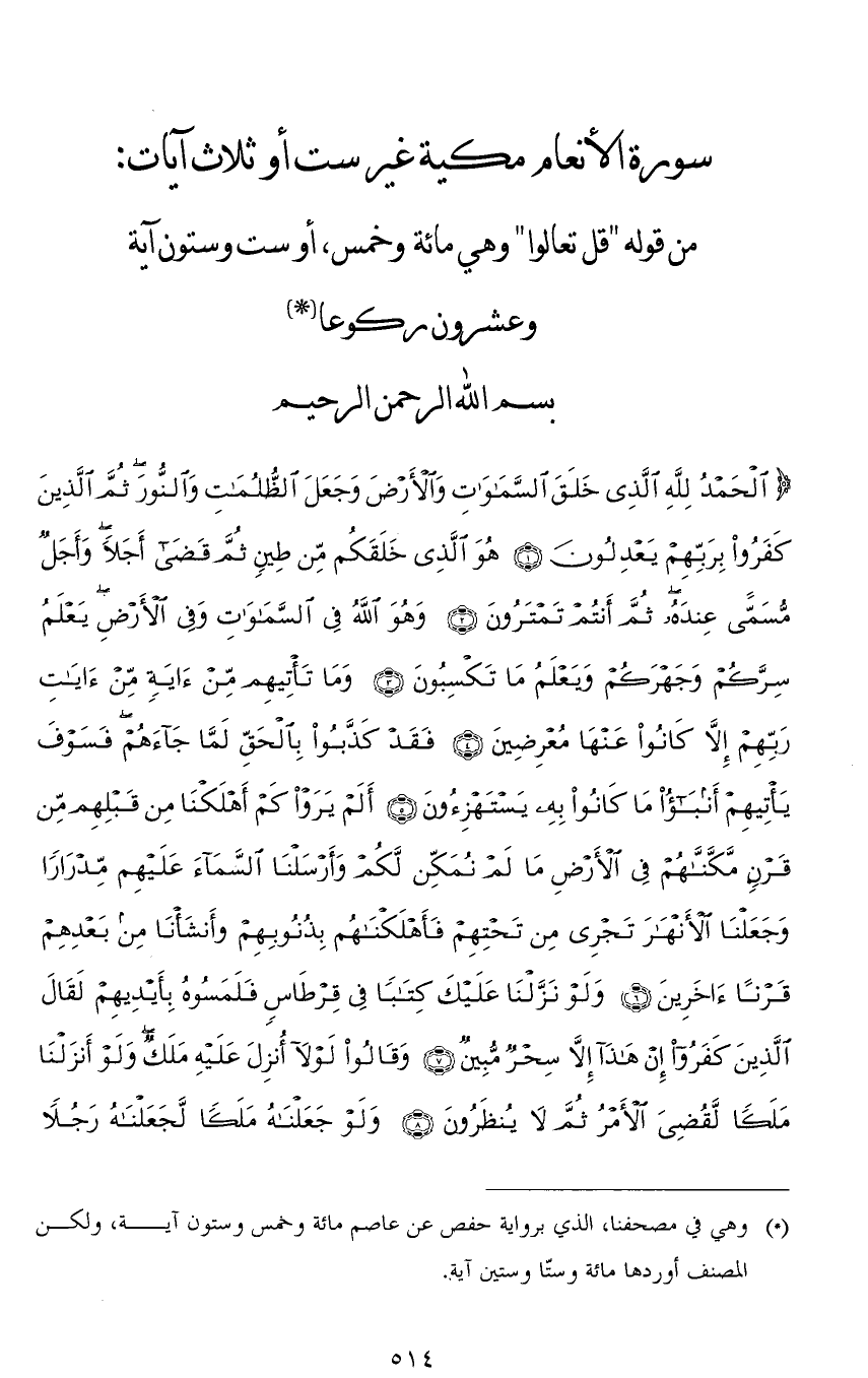 (الْحَمْدُ لله الَّذِي خَلَقَ السَّمَاوَاتِ وَالْأَرْضَ وَجَعَلَ الظُّلُمَاتِ وَالنُّورَ ثُمَّ الَّذِينَ كَفَرُوا بِرَبِّهِمْ يَعْدِلُونَ (1) هُوَ الَّذِي خَلَقَكُمْ مِنْ طِينٍ ثُمَّ قَضَى أَجَلًا وَأَجَلٌ مُسَمًّى عِنْدَهُ ثُمَّ أَنْتُمْ تَمْتَرُونَ (2) وَهُوَ اللهُ فِي السَّمَاوَاتِ وَفِي الْأَرْضِ يَعْلَمُ سِرَّكُمْ وَجَهْرَكُمْ وَيَعْلَمُ مَا تَكْسِبُونَ (3) وَمَا تَأْتِيهِمْ مِنْ آيَةٍ مِنْ آيَاتِ رَبِّهِمْ إِلَّا كَانُوا عَنْهَا مُعْرِضِينَ (4) فَقَدْ كَذَّبُوا بِالْحَقِّ لَمَّا جَاءَهُمْ فَسَوْفَ يَأْتِيهِمْ أَنْبَاءُ مَا كَانُوا بِهِ يَسْتَهْزِءُونَ (5) أَلَمْ يَرَوْا كَمْ أَهْلَكْنَا مِنْ قَبْلِهِمْ مِنْ قَرْنٍ مَكَّنَّاهُمْ فِي الْأَرْضِ مَا لَمْ نُمَكِّنْ لَكُمْ وَأَرْسَلْنَا السَّمَاءَ عَلَيْهِمْ مِدْرَارًا وَجَعَلْنَا الْأَنْهَارَ تَجْرِي مِنْ تَحْتِهِمْ فَأَهْلَكْنَاهُمْ بِذُنُوبِهِمْ وَأَنْشَأْنَا مِنْ بَعْدِهِمْ قَرْنًا آخَرِينَ (6) وَلَوْ نَزَّلْنَا عَلَيْكَ كِتَابًا فِي قِرْطَاسٍ فَلَمَسُوهُ بِأَيْدِيهِمْ لَقَالَ الَّذِينَ كَفَرُوا إِنْ هَذَا إِلَّا سِحْرٌ مُبِينٌ (7) وَقَالُوا لَوْلَا أُنْزِلَ عَلَيْهِ مَلَكٌ وَلَوْ أَنْزَلْنَا مَلَكًا لَقُضِيَ الْأَمْرُ ثُمَّ لَا يُنْظَرُونَ (8) وَلَوْ جَعَلْنَاهُ مَلَكًا لَجَعَلْنَاهُ رَجُلًا