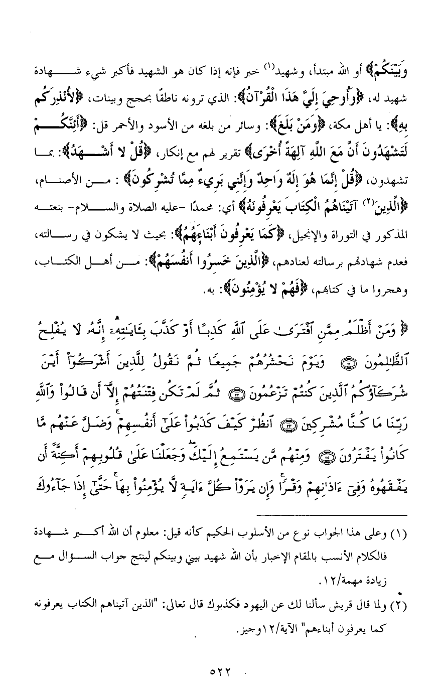 وَبَيْنَكُمْ) أو الله مبتدأ، وشهيد خبر فإنه إذا كان هو الشهيد فأكبر شيء شهادة شهيد له، (وَأُوحِيَ إِلَيَّ هَذَا الْقُرْآنُ): الذي ترونه ناطقًا بحجج وبينات، (لِأُنْذِرَكُمْ بِهِ): يا أهل مكة، (وَمَنْ بَلَغَ): وسائر من بلغه من الأسود والأحمر قل: (أَئِنَّكُم لَتشْهَدُونَ أَن مَعَ اللهِ آلِهَةً أُخْرَى) تقرير لهم مع إنكار، (قُلْ لا أَشْهَدُ): بما تشهدون، (قلْ إِنَّمَا هُوَ إِلَىٌ وَاحِدٌ وَإِننِي بَرِيءٌ مِمَّا تُشْرِكُون): من الأصنام، (الذِينَ آتيْنَاهُمُ الْكِتَابَ يَعْرِفُونَه) أي: محمدًا - عليه الصلاة والسلام - بنعته المذكور في التوراة والإنجيل، (كَمَا يَعْرِفُونَ أَبْنَاءَهُمُ): بحيث لا يشكون في رسالته، فعدم شهادكم برسالته لعنادهم، (الَّذِينَ خَسِرُوا أَنْفُسَهُمْ): من أهل الكتاب، وهجروا ما في كتابهم، (فَهُمْ لَا يُؤْمِنُونَ): به.