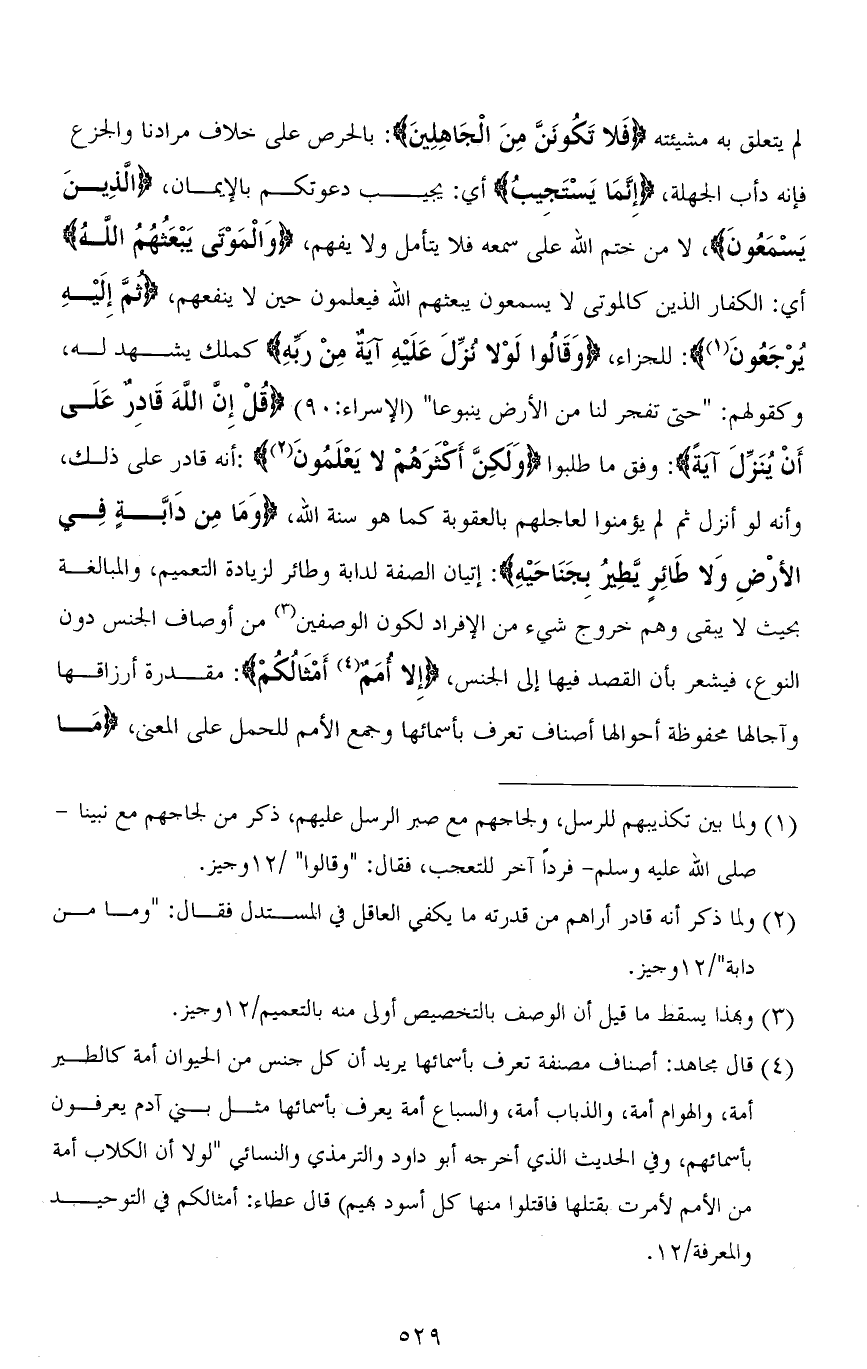 لم يتعلق به مشيئته (فَلَا تَكُونَنَّ مِنَ الْجَاهِلِينَ): بالحرص على خلاف مرادنا والجزع فإنه دأب الجهلة، (إِنَّمَا يَسْتَجِيبُ) أي: يجيب دعوتكم بالإيمان، (الذِينَ يَسْمَعُونَ)، لا من ختم الله على سمعه فلا يتأمل ولا يفهم، (وَالْمَوْتَى يَبْعَثُهُمُ اللهُ) أي: الكفار الذين كالموتى لا يسمعون يبعثهم الله فيعلمون حين لا ينفعهم، (ثمَّ إِلَيْهِ يُرْجَعُونَ): للجزاء، (وَقَالُوا لَوْلَا نُزِّلَ عَلَيْهِ آيَةٌ مِنْ رَبِّهِ) كمَلَكٍ يشهد له، وكقولهم: " حَتَّى تَفْجُرَ لَنَا مِنَ الْأَرْضِ يَنْبُوعًا " [الاسراء: 90] (قُلْ إِنَّ اللهَ قَادِرٌ عَلَى أَنْ يُنَزِّلَ آيةً): وفق ما طلبوا (وَلَكِنَّ أَكْثَرَهُمْ لا يَعْلَمُونَ): أنه قادر على ذلك، وأنه لو أنزل ثم لم يؤمنوا لعاجلهم بالعقوبة كما هو سنة الله، (وَمَا مِنْ دَابَّةٍ فِي الْأَرْضِ وَلَا طَائِرٍ يَطِيرُ بِجَنَاحَيْهِ): إتيان الصفة لدابة وطائر لزيادة التعميم، والمبالغة بحيث لا يبقى وهم خروج شيء من الإفراد لكون الوصفين من أوصاف الجنس دون النوع، فيشعر بأن القصد فيها إلى الجنس، (إِلَّا أُمَمٌ أَمْثَالُكُمْ): مقدرة أرزاقها وآجالها محفوظة أحوالها أصناف تعرف بأسمائها وجمع الأمم للحمل على المعنى، (مَا