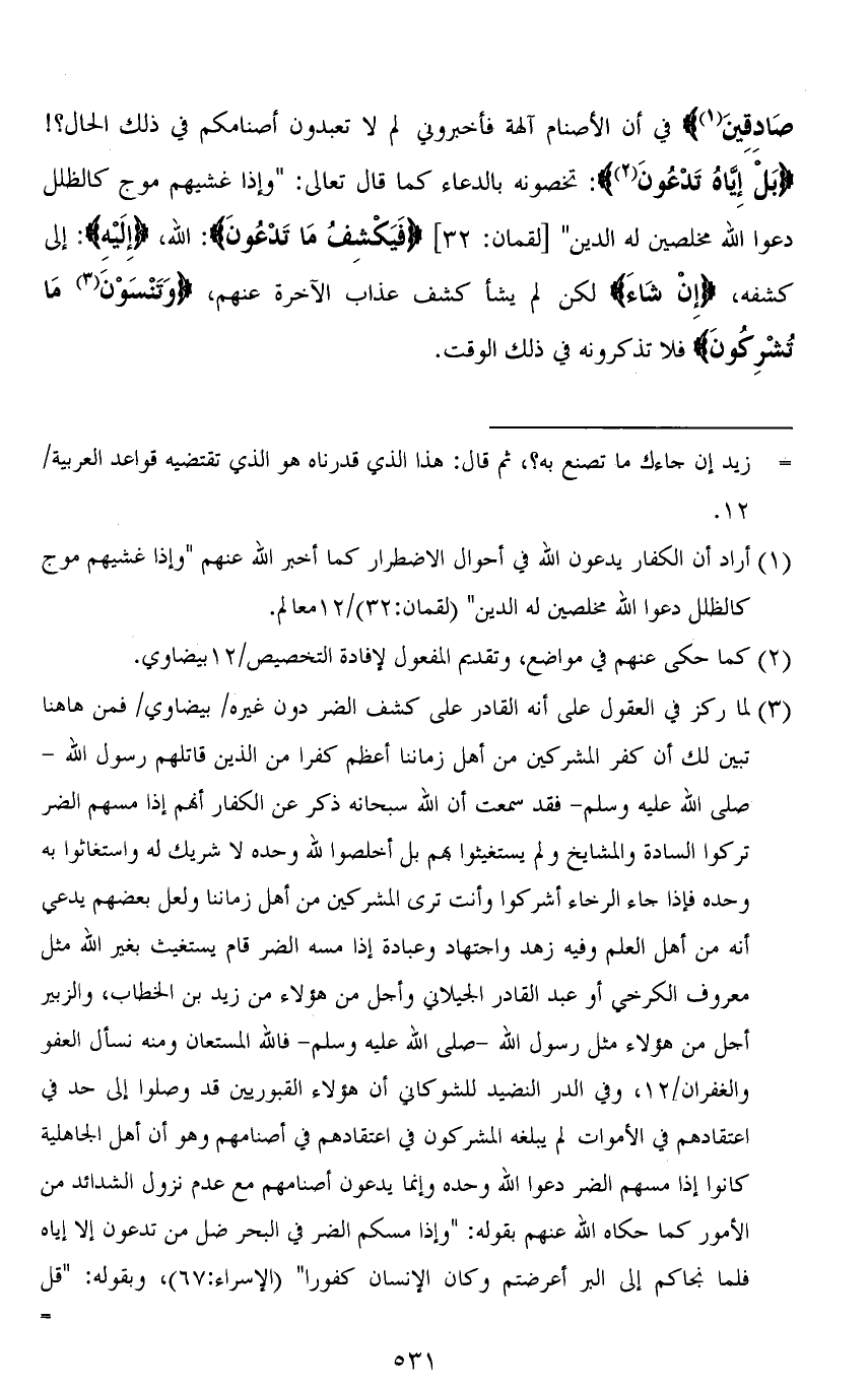 صَادِقِينَ) في أن الأصنام آلهة فأخبروني لم لا تعبدون أصنامكم في ذلك الحال؟! (بَلْ إِيَّاهُ تَدْعُونَ): تخصونه بالدعاء كما قال تعالى: (وَإِذَا غَشِيَهُمْ مَوْجٌ كَالظُّلَلِ دَعَوُا اللهَ مُخْلِصِينَ لَهُ الدِّينَ) [لقمان: 32] (فَيَكْشِفُ مَا تَدْعُونَ): الله، (إِلَيْهِ): إلى كشفه، (إِنْ شَاءَ) لكن لم يشأ كشف عذاب الآخرة عنهم، (وَتَنْسَوْنَ مَا تُشْرِكُونَ) فلا تذكرونه في ذلك الوقت.