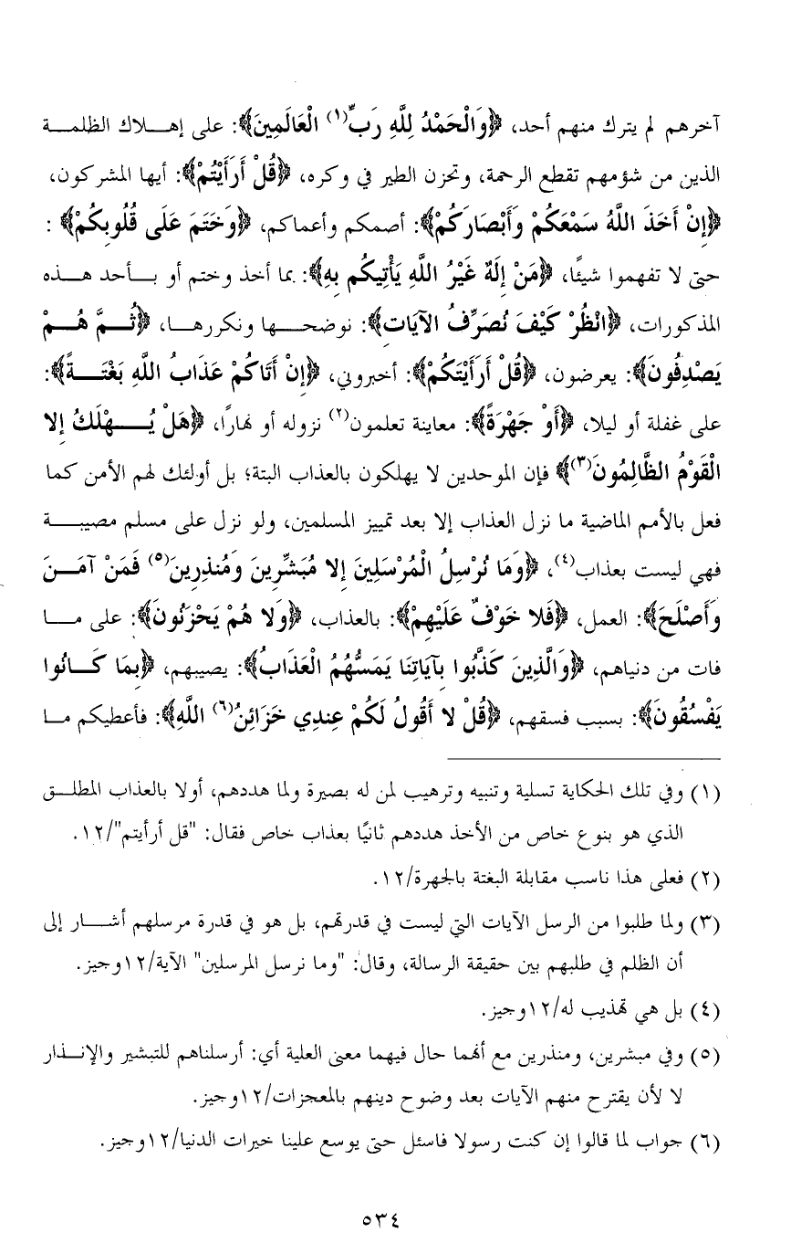 آخرهم لم يترك منهم أحد، (وَالْحَمْدُ للهِ رَبِّ الْعَالَمِينَ): على إهلاك الظلمة الذين من شؤمهم تقطع الرحمة، وتحزن الطير في وكره، (قُلْ أَرَأَيْتَكُمْ): أيها المشركون، (إِنْ أَخَذَ اللهُ سَمْعَكُمْ وَأَبْصَارَكُمْ): أصمكم وأعماكم، (وَخَتَمَ عَلَى قُلُوبِكُمْ): حتى لا تفهموا شيئًا، (مَنْ إِلَهٌ غَيْرُ اللهِ يَأْتِيكُمْ بِهِ): بما أخذ وختم أو بأحد هذه المذكورات، (انظُرْ كَيْفَ نصَرِّفُ الآيَاتِ): نوضحها ونكررها، (ثُمَّ هُم يَصْدِْفُون): يعرضون، (قُلْ أَرَأَيْتَكُمْ): أخبروني، (إِنْ أَتَاكُمْ عَذَابُ اللهِ بَغْتَةً): على غفلة أو ليلاً، (أَوْ جَهْرَةً): معاينة تعلمون نزوله أو نهارًا، (هَلْ يُهْلَكُ إِلا الْقَوْمُ الظّالِمُون) فإن الموحدين لا يهلكون بالعذاب ألبتة بل (أولئك لهم الأمن) كما فعل بالأمم الماضية ما نزل العذاب إلا بعد تمييز المسلمين، ولو نزل على مسلم مصيبة فهي ليست بعذاب، (وَمَا نُرْسِلُ الْمُرْسَلِينَ إِلَّا مُبَشِّرِينَ وَمُنْذِرِينَ فَمَنْ آمَنَ وَأَصْلَحَ): العمل، (فَلَا خَوْفٌ عَلَيْهِمْ): بالعذاب، (وَلَا هُمْ يَحْزَنُونَ) على ما فات من دنياهم، (وَالّذِينَ كَذَّبُوا بِآيَاتِنَا يَمَسُّهُمُ الْعَذَابُ): يصيبهم، (بِمَا كَانُوا يفْسُقُون): بسبب فسقهم، (قُلْ لا أَقُولُ لَكُمْ عِندِي خَزَائِنُ اللهِ): فأعطيكم ما
