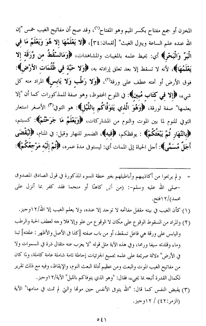 المخزن أو جمع مِفتاح بكسر الميم وهو المفتاح، وقد صح أن مفاتيح الغيب خمس " إِنَّ اللهَ عِنْدَهُ عِلْمُ السَّاعَةِ وَيُنَزِّلُ الْغَيْثَ " [لقمان: 34] (لَا يَعْلَمُهَا إِلَّا هُوَ وَيَعْلَمُ مَا فِي الْبَرِّ وَالْبَحْرِ) أي: يحيط علمه بالمغيبات والمشاهدات، (وَمَا تَسْقُطُ مِنْ وَرَقَةٍ إِلَّا يَعْلَمُهَا)، لأنه لا تسقط إلا بعد تعلق إرادته به، (وَلَا حَبَّةٍ فِي ظُلُمَاتِ الْأَرْضِ): فوق الأرض أو تحته عطف على ورقة، (وَلَا رَطْبٍ وَلَا يَابِسٍ) المراد منه كل شيء، (إِلَّا فِي كِتَابٍ مُبِينٍ): في اللوح المحفوظ، وهو صفة للمذكورات كما أن " إلا يعلمها " صفة لورقة، (وَهُوَ الذِي يَتَوَفاكُم بِالليلِ): هو التوفي الأصغر استعار التوفي للنوم لما بين الموت والنوم من المشاركات، (وَيَعْلَمُ مَا جَرَحْتُمْ): كسبتم، (بِالنَّهَارِ ثُمَّ يَبْعَثُكُمْ): يوقظكم، (فِيهِ)، الضمير للنهار وقيل: في المنام، (لِيُقْضَى أَجَلٌ مُسَمًّى): أجل الحياة إلى الممات أي: ليستوفي مدة عمره، (ثُمَّ إِلَيْهِ مَرْجِعُكُمْ):