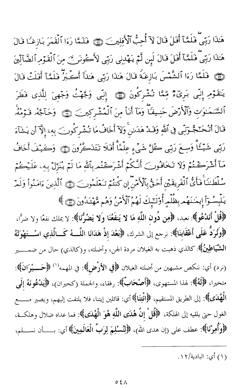 هَذَا رَبِّي فَلَمَّا أَفَلَ قَالَ لَا أُحِبُّ الْآفِلِينَ (76) فَلَمَّا رَأَى الْقَمَرَ بَازِغًا قَالَ هَذَا رَبِّي فَلَمَّا أَفَلَ قَالَ لَئِنْ لَمْ يَهْدِنِي رَبِّي لَأَكُونَنَّ مِنَ الْقَوْمِ الضَّالِّينَ (77) فَلَمَّا رَأَى الشَّمْسَ بَازِغَةً قَالَ هَذَا رَبِّي هَذَا أَكْبَرُ فَلَمَّا أَفَلَتْ قَالَ يَا قَوْمِ إِنِّي بَرِيءٌ مِمَّا تُشْرِكُونَ (78) إِنِّي وَجَّهْتُ وَجْهِيَ لِلَّذِي فَطَرَ السَّمَاوَاتِ وَالْأَرْضَ حَنِيفًا وَمَا أَنَا مِنَ الْمُشْرِكِينَ (79) وَحَاجَّهُ قَوْمُهُ قَالَ أَتُحَاجُّونِّي فِي اللهِ وَقَدْ هَدَانِ وَلَا أَخَافُ مَا تُشْرِكُونَ بِهِ إِلَّا أَنْ يَشَاءَ رَبِّي شَيْئًا وَسِعَ رَبِّي كُلَّ شَيْءٍ عِلْمًا أَفَلَا تَتَذَكَّرُونَ (80) وَكَيْفَ أَخَافُ مَا أَشْرَكْتُمْ وَلَا تَخَافُونَ أَنَّكُمْ أَشْرَكْتُمْ بِاللهِ مَا لَمْ يُنَزِّلْ بِهِ عَلَيْكُمْ سُلْطَانًا فَأَيُّ الْفَرِيقَيْنِ أَحَقُّ بِالْأَمْنِ إِنْ كُنْتُمْ تَعْلَمُونَ (81) الَّذِينَ آمَنُوا وَلَمْ يَلْبِسُوا إِيمَانَهُمْ بِظُلْمٍ أُولَئِكَ لَهُمُ الْأَمْنُ وَهُمْ مُهْتَدُونَ (82)